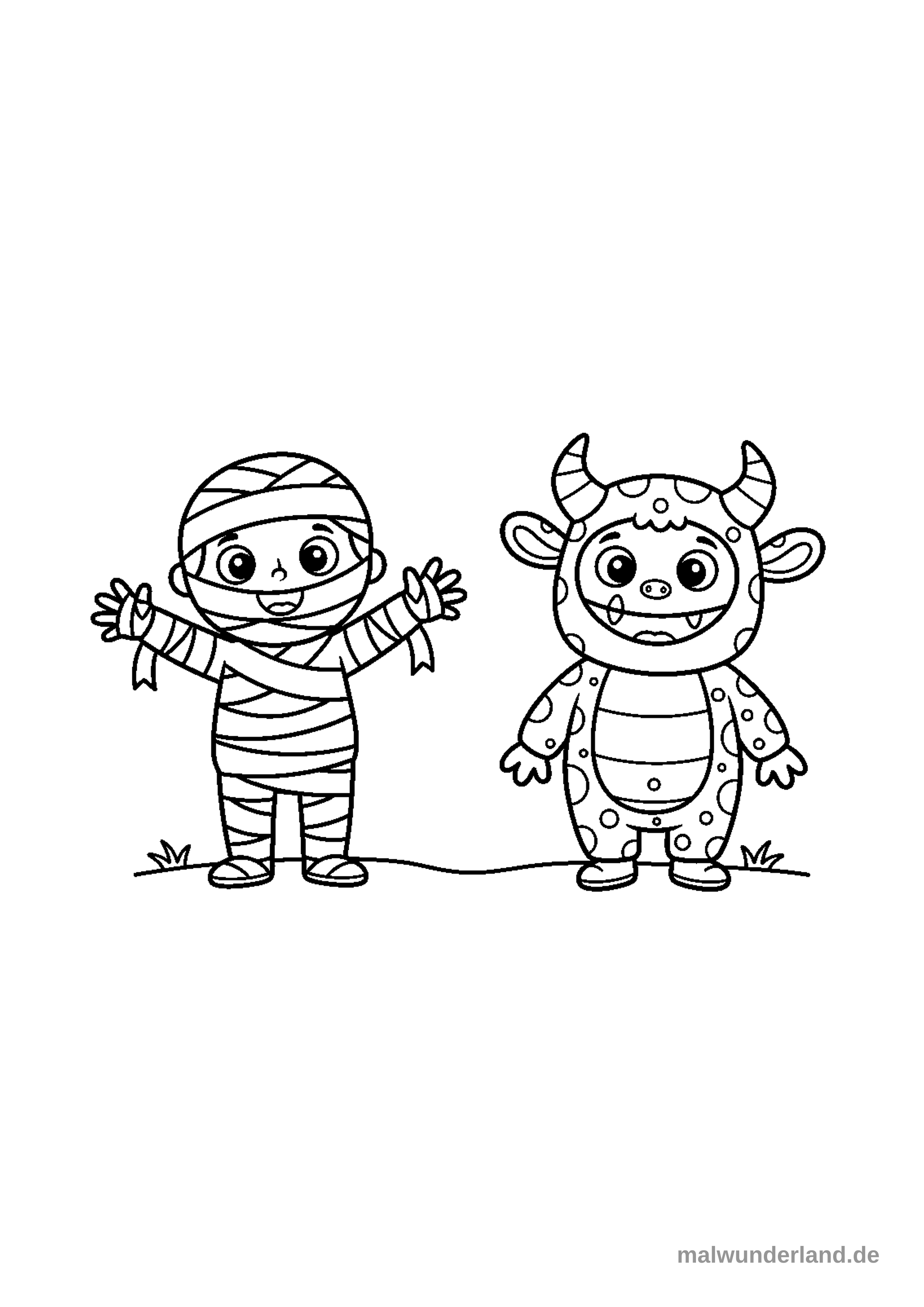 Male die Bandagen der Mumie in einem hellen Weiß oder Beige. Die Augen des Kindes unter den Bandagen könnten braun oder blau sein. Das Monsterkostüm könnte in leuchtendem Grün oder Blau sein. Die Punkte auf dem Monsterkostüm kannst du in einer kontrastierenden Farbe wie Gelb oder Orange ausmalen. Den Boden unter den Kindern malst du am besten grasgrün, und die kleinen Grashalme können ein dunkleres Grün haben.