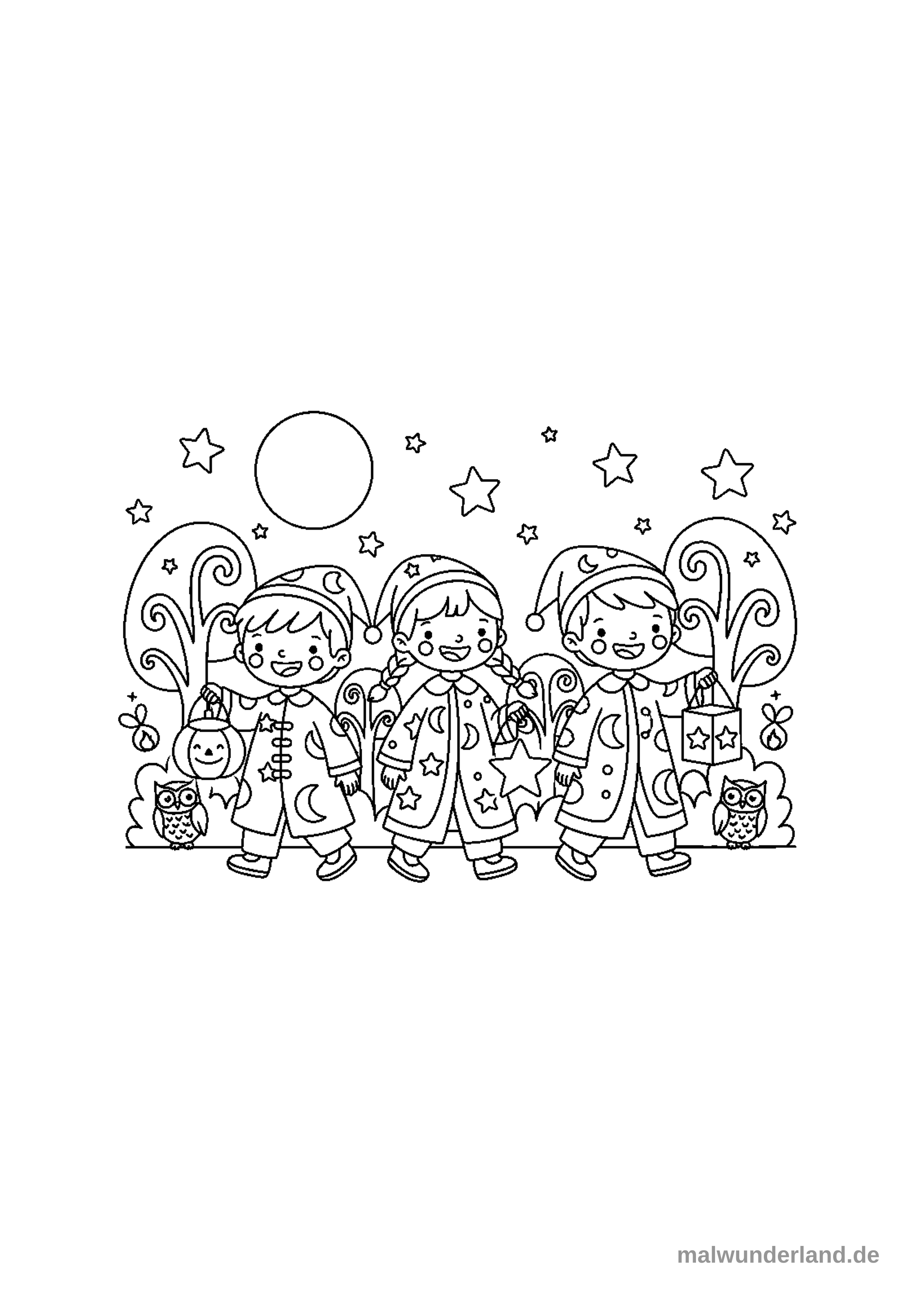 Male die Schlafanzüge der Kinder in gemütlichen Farben wie Hellblau, Rosa oder Mintgrün. Die Monde und Sterne darauf könnten in einem hellen Gelb oder Weiß hervorgehoben werden. Der Himmel könnte in einem tiefen Dunkelblau oder Violett gemalt werden, damit der helle Mond und die funkelnden Sterne schön zur Geltung kommen. Die verschiedenen Laternen kannst du farbenfroh gestalten: Die Kürbislaterne könnte orange sein, die Sternlaterne sonnengelb und die eckige Laterne rot oder grün. Die Bäume und Büsche im Hintergrund passen gut in dunklen Grüntönen. Die kleinen Eulen könnten ein weiches Braun für ihr Gefieder bekommen.
