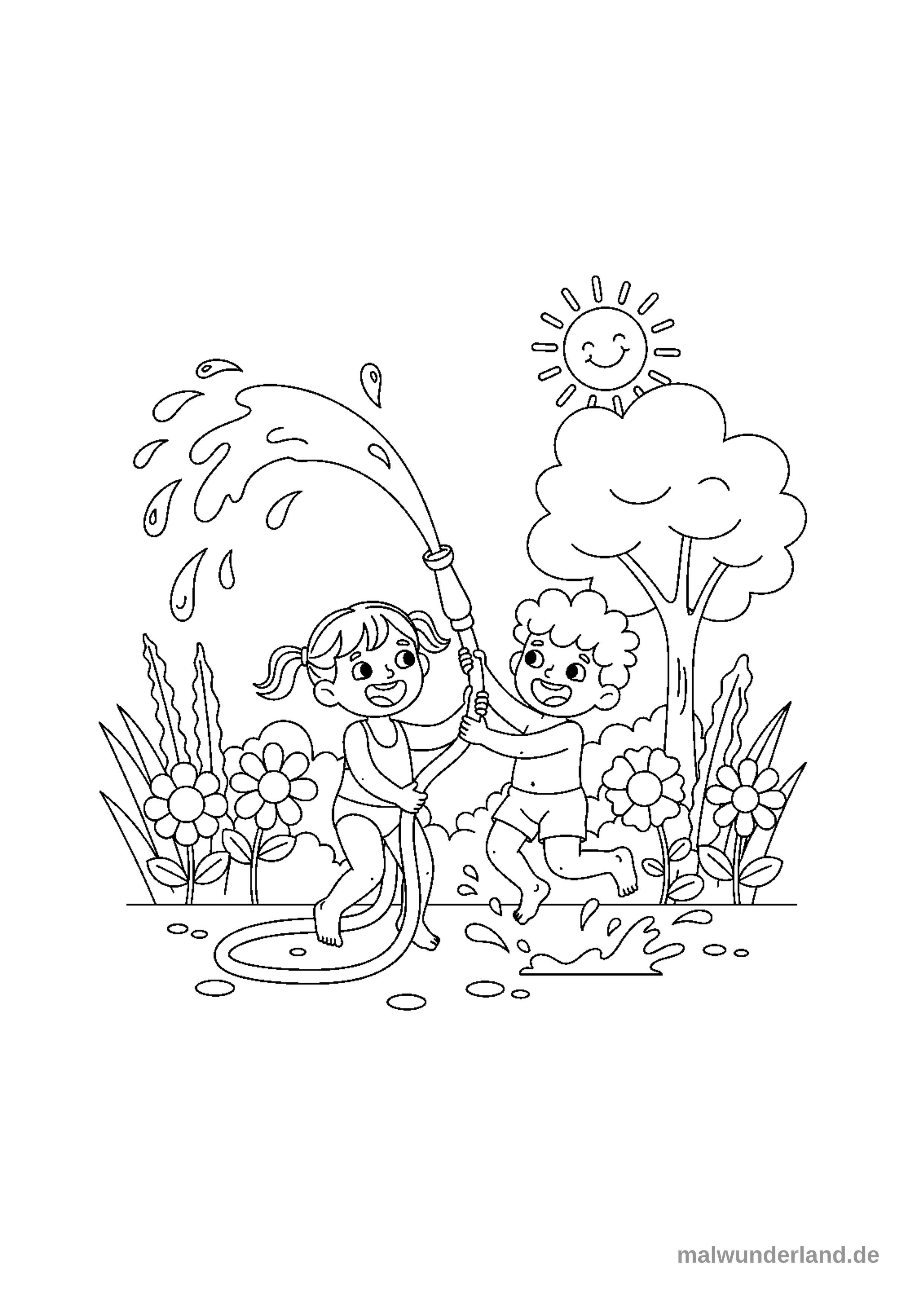 Das Ausmalbild zeigt ein Mädchen und einen Jungen, die gemeinsam im Freien mit einem Gartenschlauch spielen und Wasser spritzen. Eine lächelnde Sonne, ein Baum und blühende Pflanzen bilden die sommerliche Umgebung.