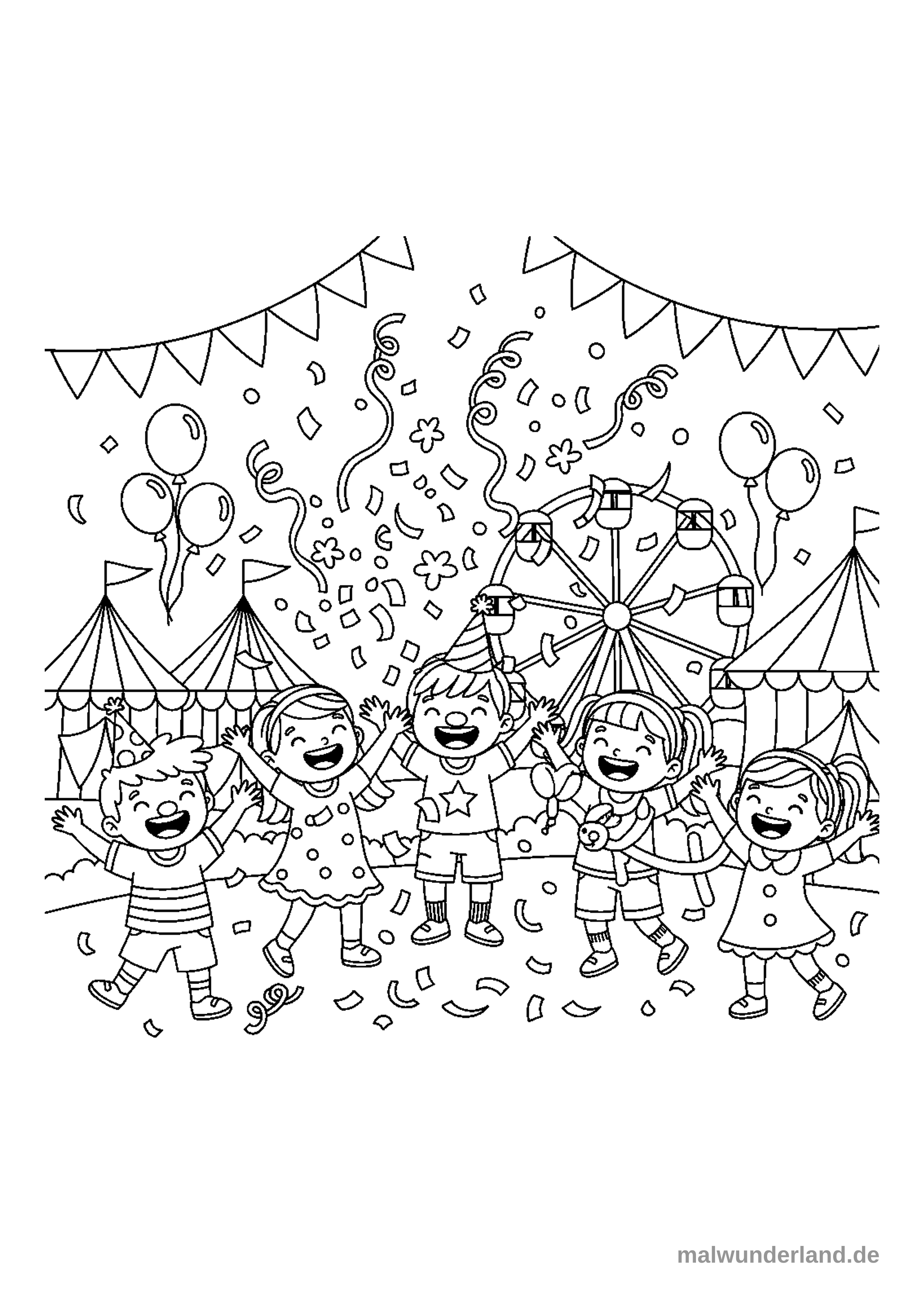 Das Ausmalbild zeigt fünf fröhlich jubelnde Kinder mit hochgereckten Armen inmitten eines Konfettiregens, der von oben herabfällt. Im Hintergrund sind ein Riesenrad, mehrere Zirkuszelte und Luftballons zu sehen, umrahmt von einer Wimpelkette.