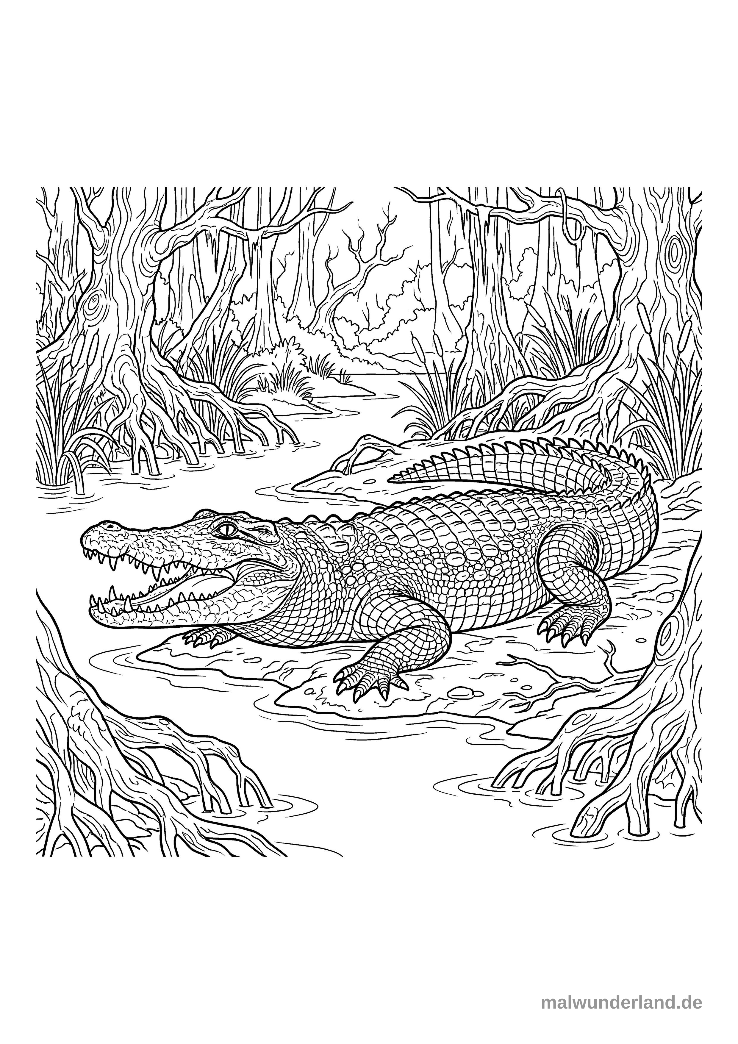 Ein detailliertes Ausmalbild zeigt ein großes Krokodil, das teilweise im Wasser und auf dem Ufer eines Sumpfgebietes ruht, umgeben von dichten Baumwurzeln, Schilf und ruhigem Wasser. Das Krokodil hat sein Maul leicht geöffnet und ist detailliert mit Schuppen gezeichnet.