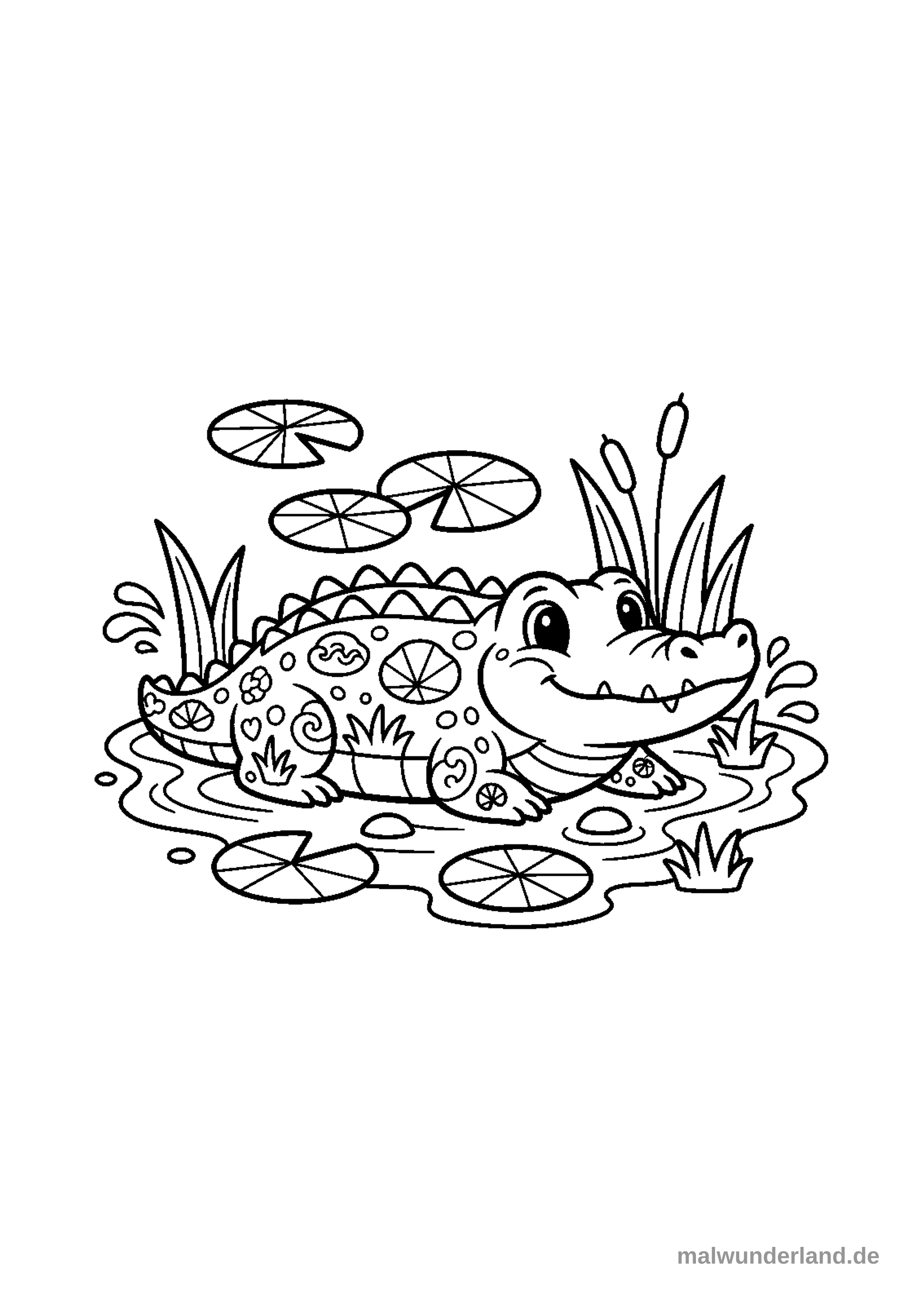 Ein Krokodil, das im Sumpf liegt und lauert. Seine Haut ist mit Sumpfpflanzen und Wassermotiven verziert.