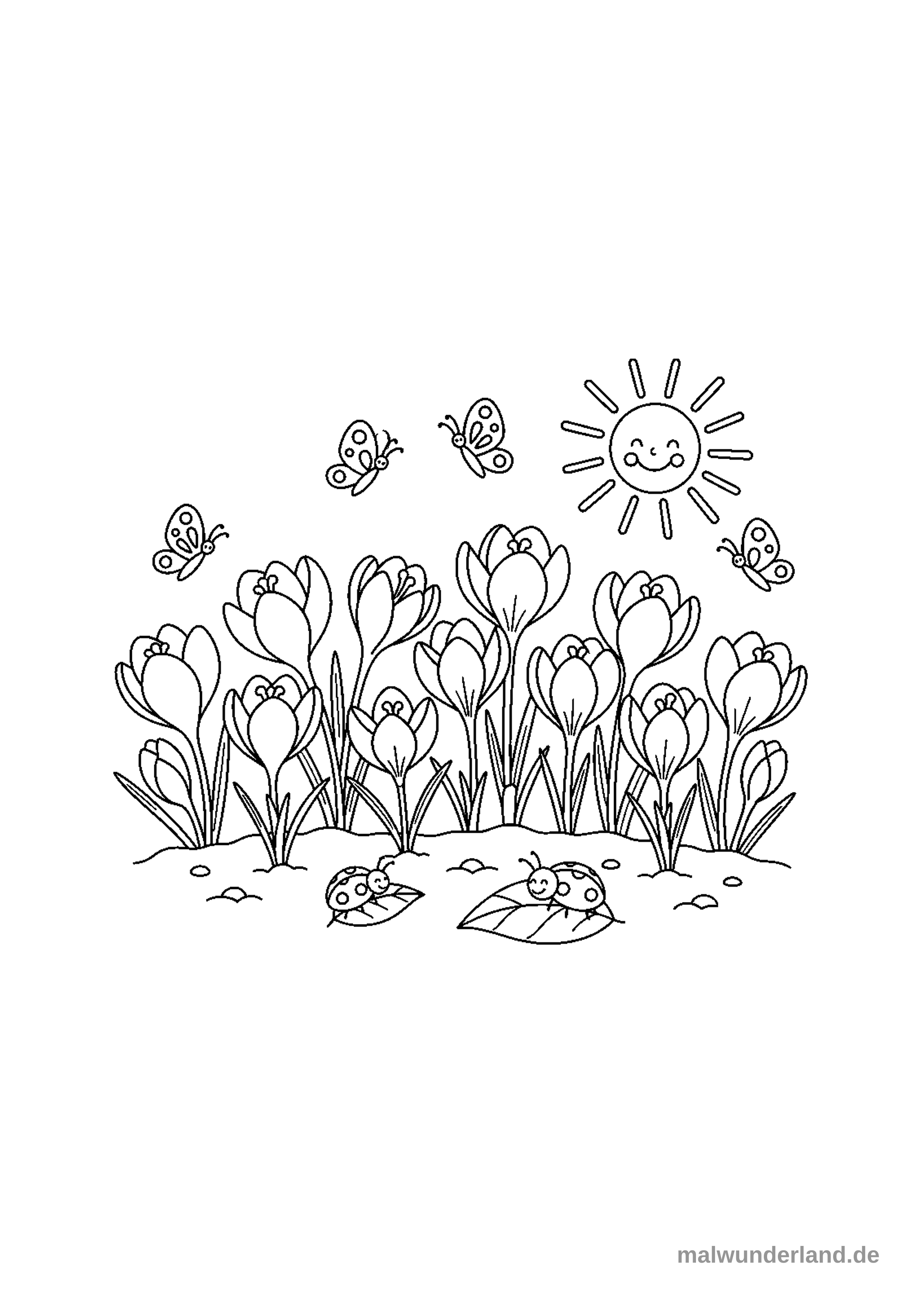 Das Bild zeigt ein fröhliches Ausmalmotiv mit einer Wiese voller blühender Krokusse unter einer lächelnden Sonne. Mehrere Schmetterlinge fliegen umher und am unteren Bildrand krabbeln zwei Marienkäfer auf Blättern.