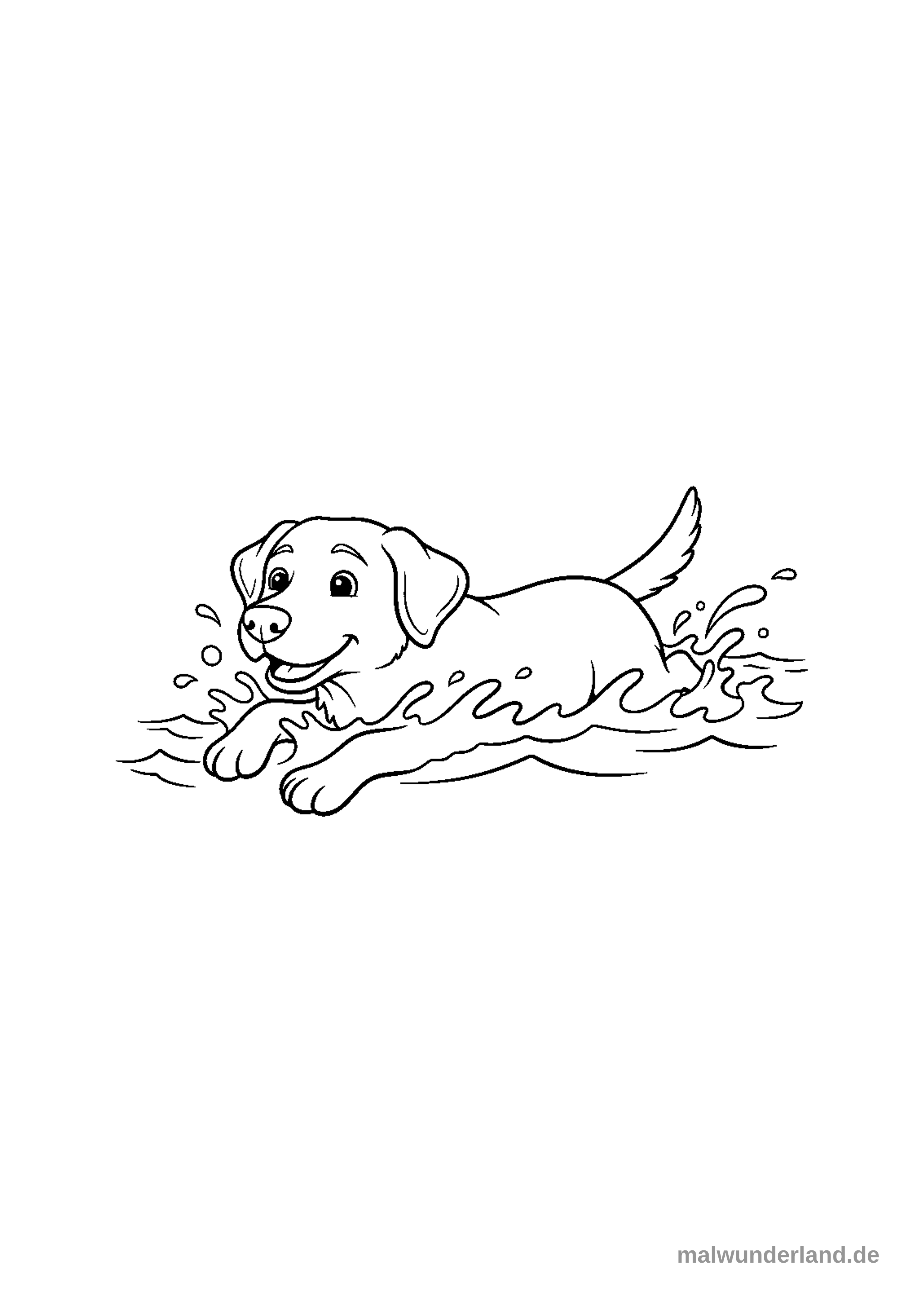 Das Ausmalbild zeigt einen fröhlichen Labradorhund, der gerade im Wasser schwimmt. Der Hund blickt nach vorne, lächelt und erzeugt mit seinen Bewegungen Wellen und Wasserspritzer um sich herum.