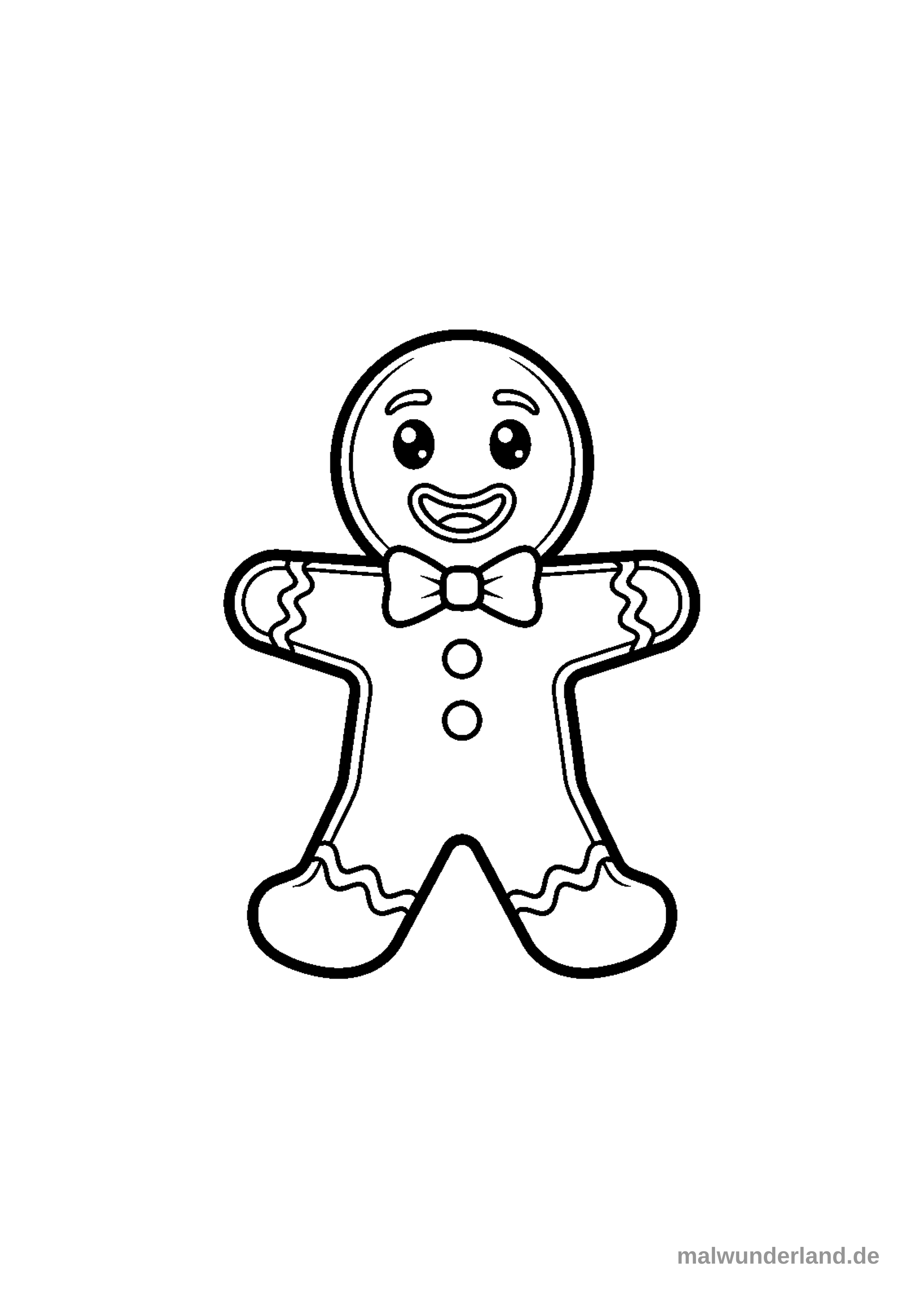 Das Bild zeigt die Schwarz-Weiß-Umrisse eines freundlich lächelnden Lebkuchenmannes. Er trägt eine Fliege und hat zwei runde Knöpfe auf seinem Körper, während seine Arme und Beine mit wellenförmigem Zuckerguss verziert sind.