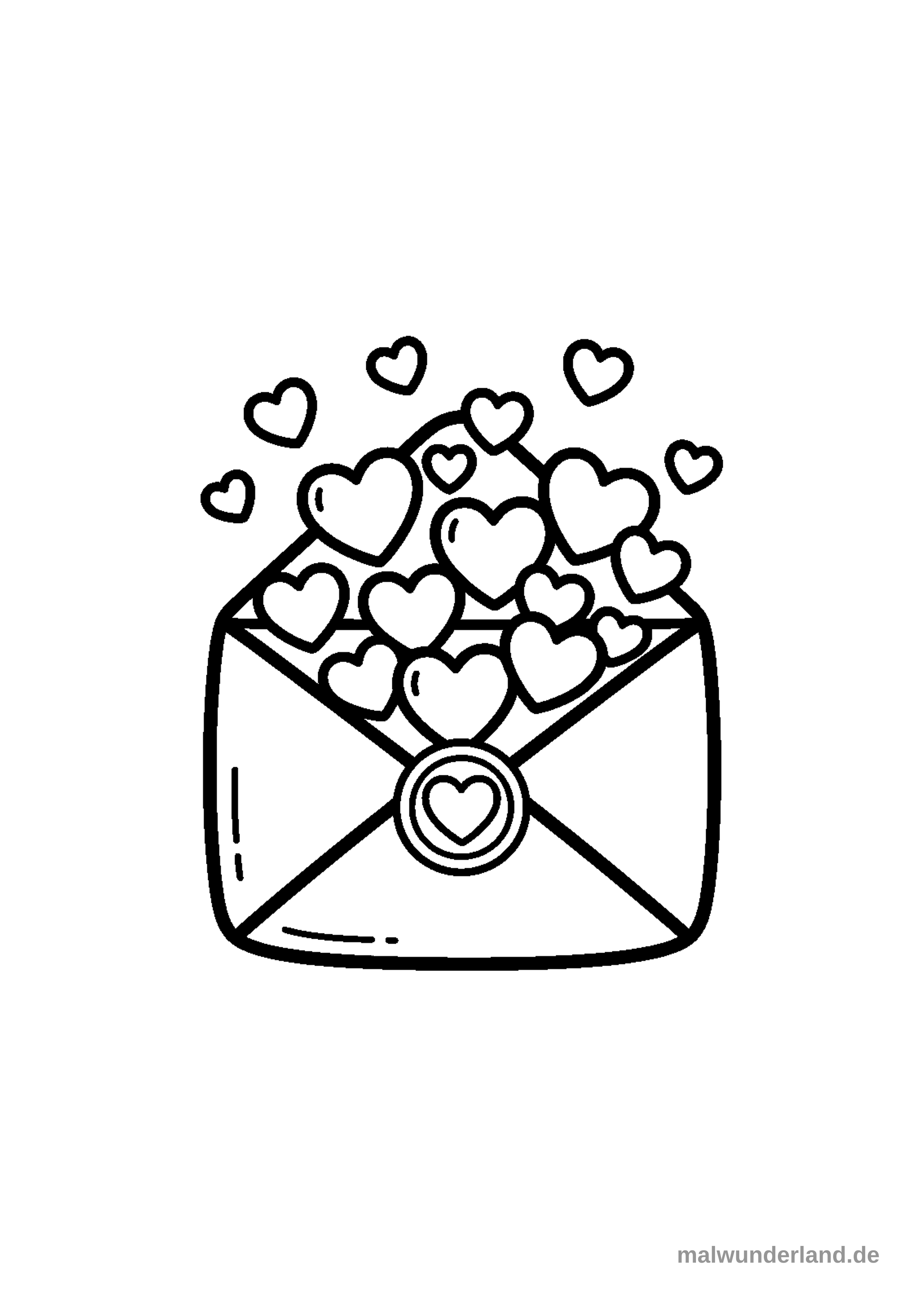 Male den Briefumschlag in einem schönen hellen Gelb oder Beige, damit er alt und wichtig aussieht. Die vielen Herzen können in verschiedenen Rottönen wie leuchtendem Rot, zartem Pink und dunklem Magenta ausgemalt werden. Das runde Siegel am Umschlag könnte ein glänzendes Gold oder Silber sein, mit einem roten Herzen in der Mitte. Die Herzen, die aus dem Umschlag fliegen, könnten auch in zarten Pastellfarben wie Hellblau oder Lavendel sein, als ob sie im Wind schweben.