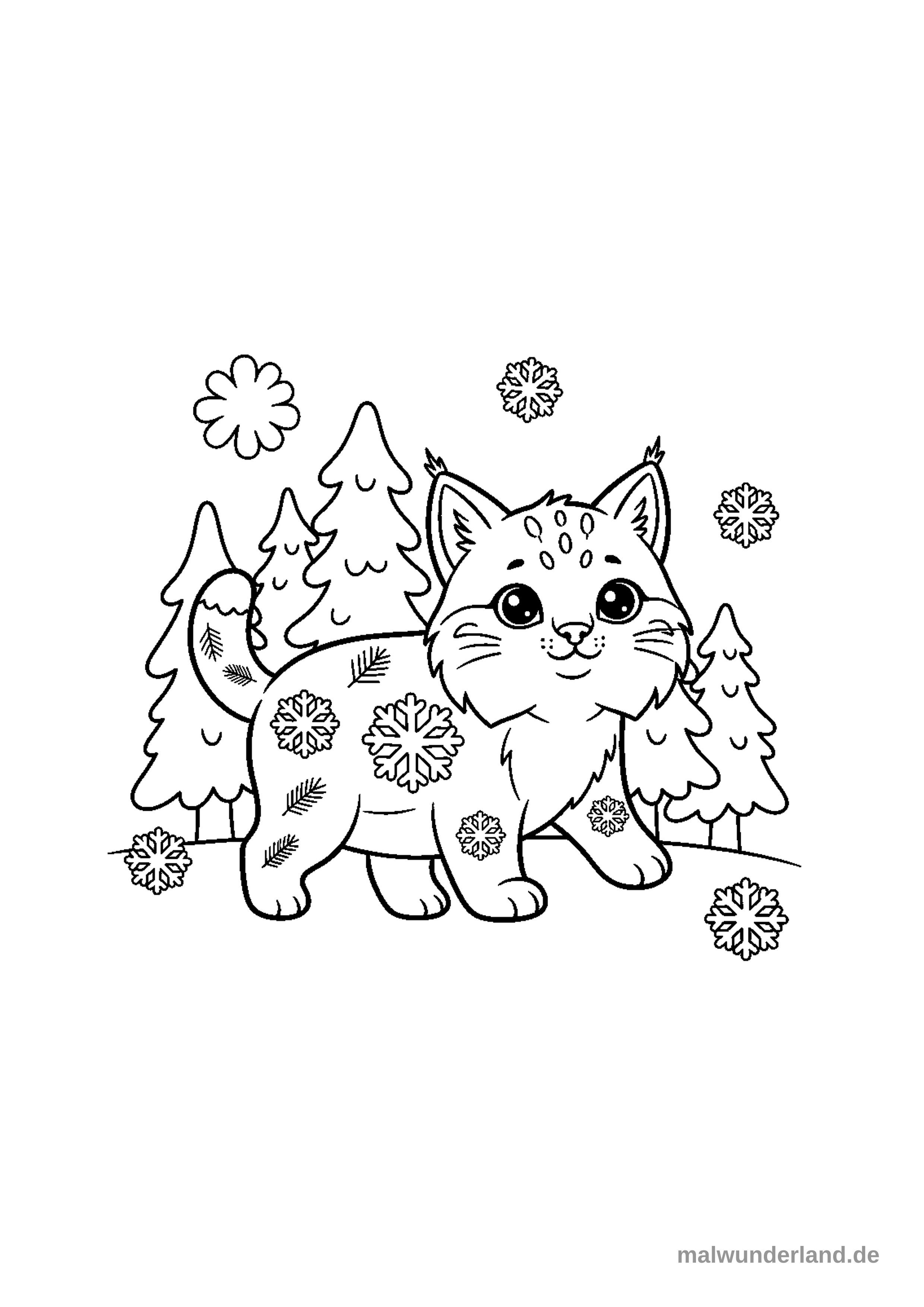 Ein Luchs, der durch einen verschneiten Winterwald schleicht. Sein Fell ist mit Schneeflocken und Tannenzweigen verziert.