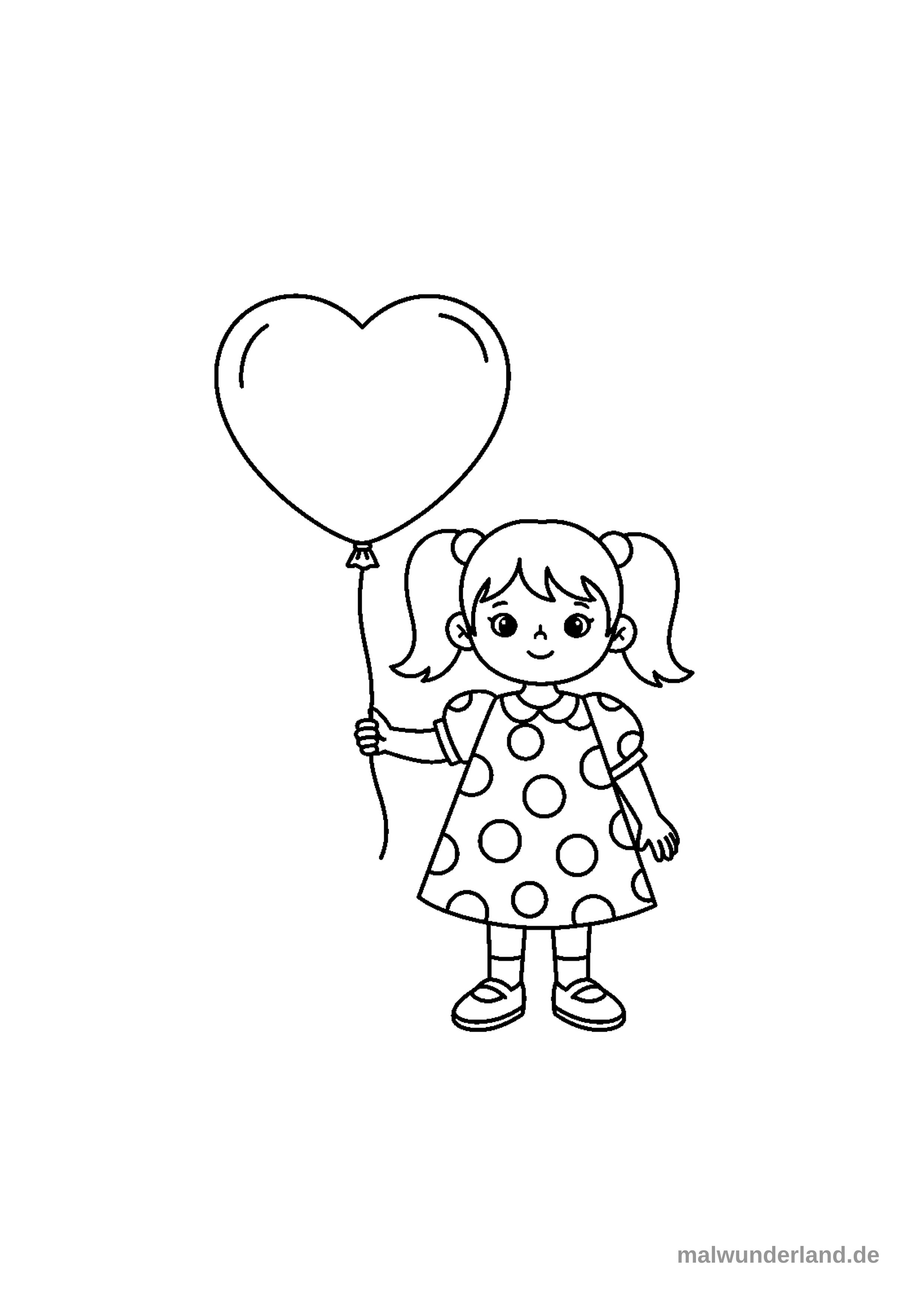 Ein lächelndes Mädchen mit Zöpfen und einem gepunkteten Kleid hält einen großen, herzförmigen Luftballon in der Hand. Die schwarz-weiße Umrisszeichnung ist bereit zum Ausmalen.