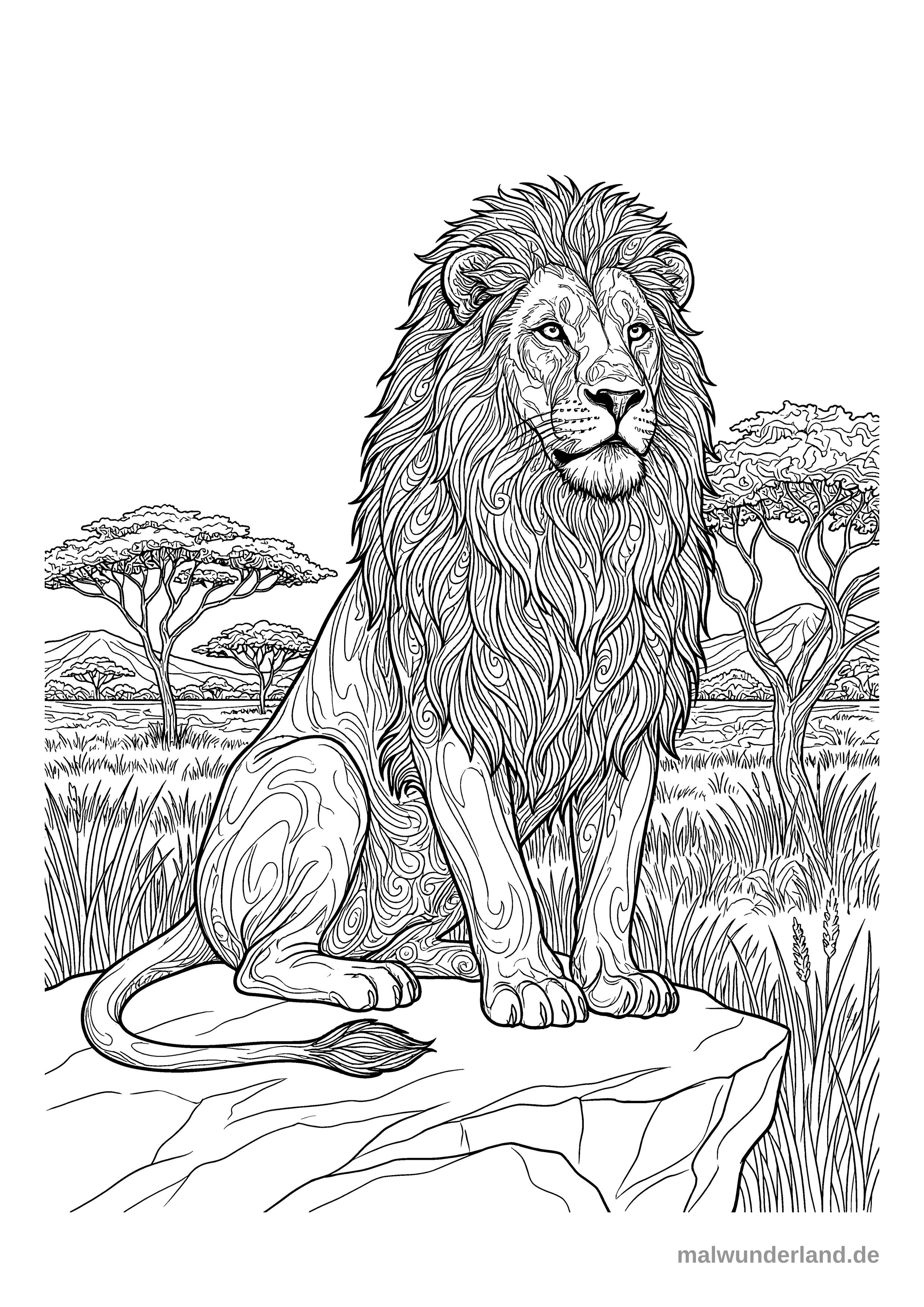 Das Ausmalbild zeigt einen detaillierten Löwen mit einer kunstvoll gestalteten Mähne und Fellmustern, der auf einem Felsen in einer weiten Savannenlandschaft sitzt. Im Hintergrund sind Akazienbäume, hohes Gras und sanfte Hügel zu erkennen.
