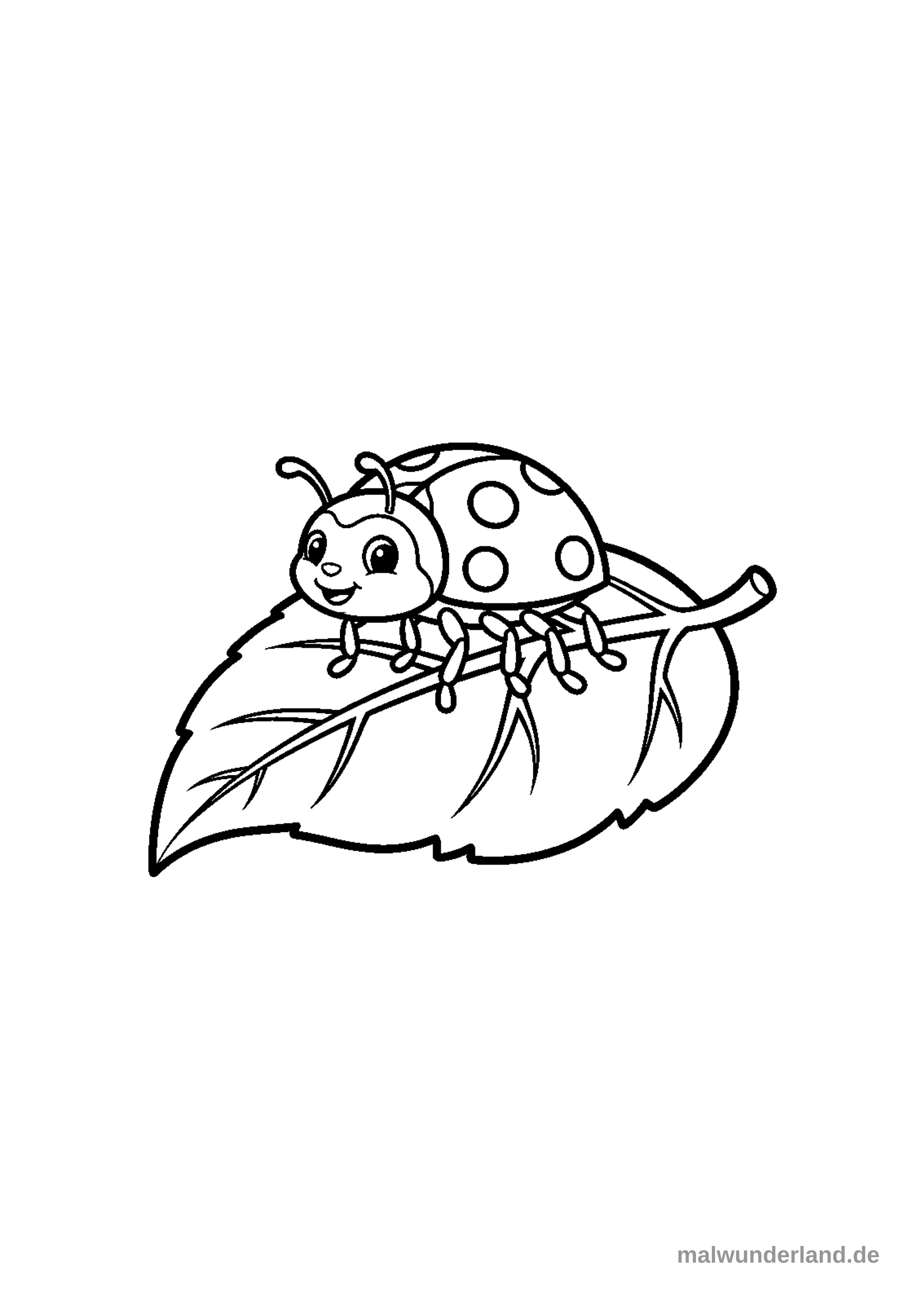 Das Ausmalbild zeigt einen lächelnden Marienkäfer, der auf einem großen Blatt sitzt. Der Marienkäfer hat Fühler und deutlich sichtbare Punkte auf seinem Rücken.