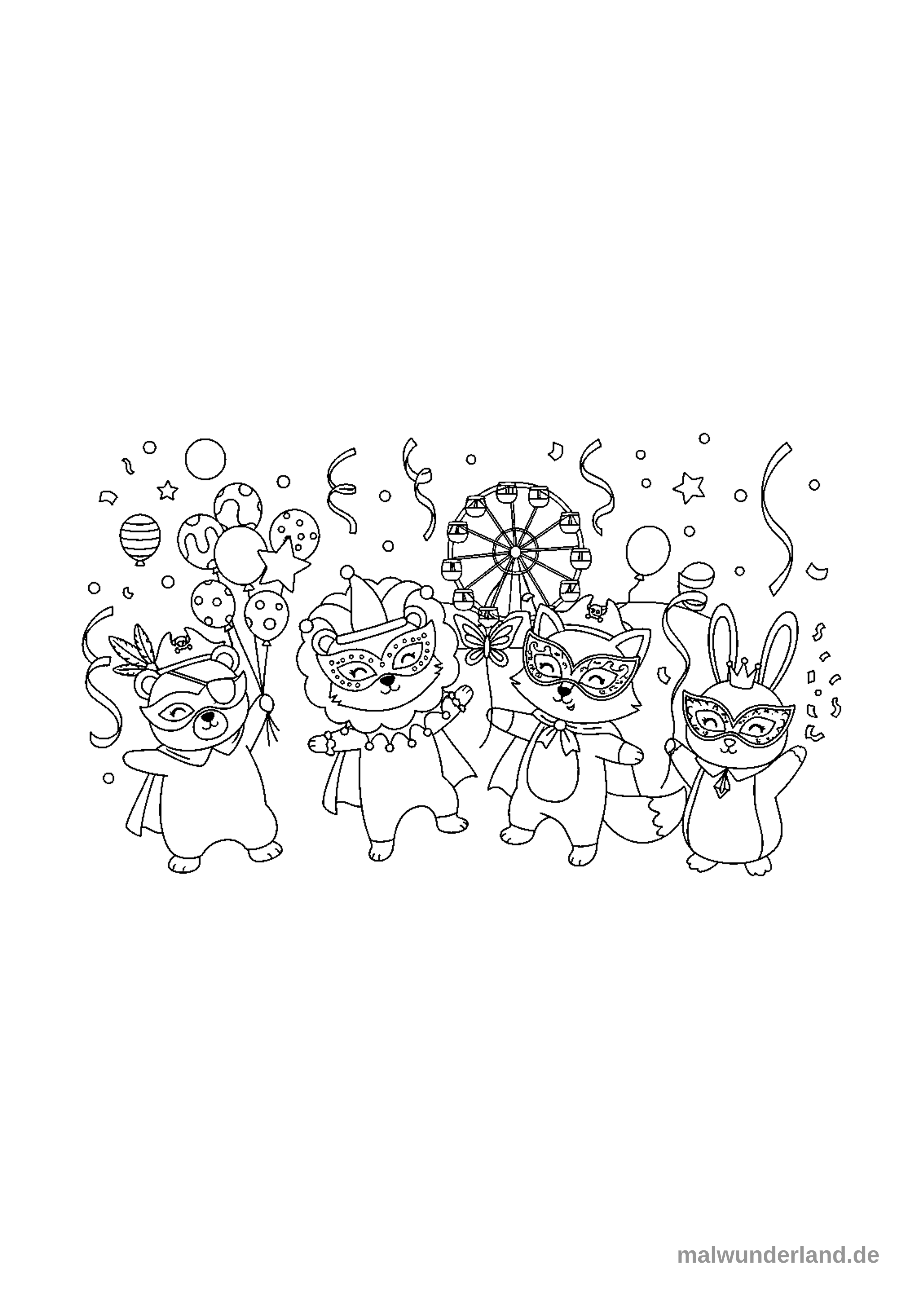 Das Ausmalbild zeigt vier niedliche Tiere – einen Bären, einen Löwen, einen Fuchs und ein Kaninchen – die kostümiert auf einem Maskenball tanzen. Über ihnen schweben Luftballons, Konfetti und eine große Ferris wheel ist im Hintergrund zu sehen.