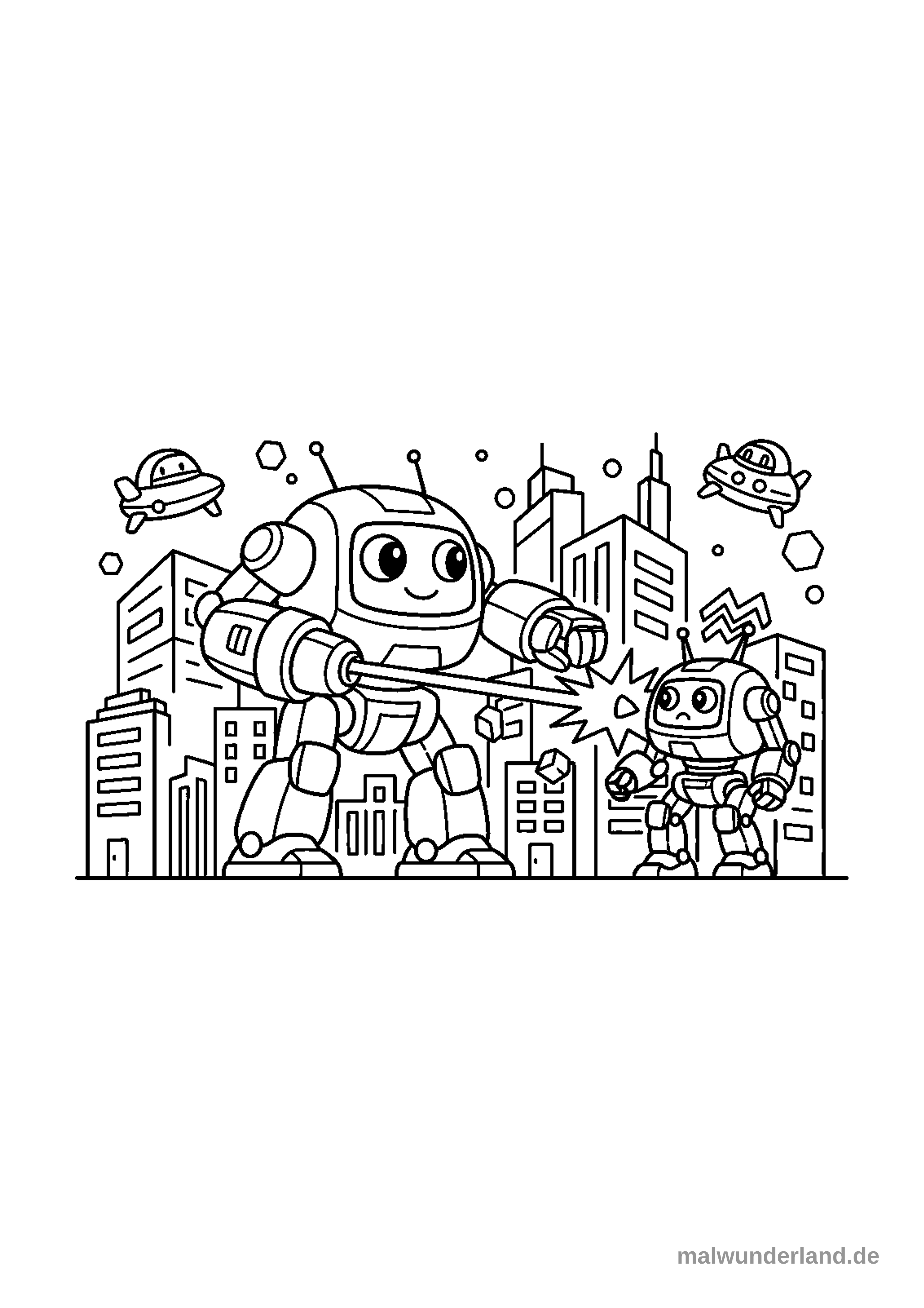 Male den großen Roboter in einem hellen Blau. Seine Augen könnten fröhlich gelb leuchten. Der kleinere Roboter könnte in einem glänzenden Silberton gemalt werden, und die Funken, die beim Treffer entstehen, leuchten in Rot und Orange. Die Gebäude im Hintergrund kannst du in verschiedenen Grautönen und mit einigen gelb leuchtenden Fenstern gestalten. Die kleinen fliegenden Untertassen könnten lustig grün oder lila sein.