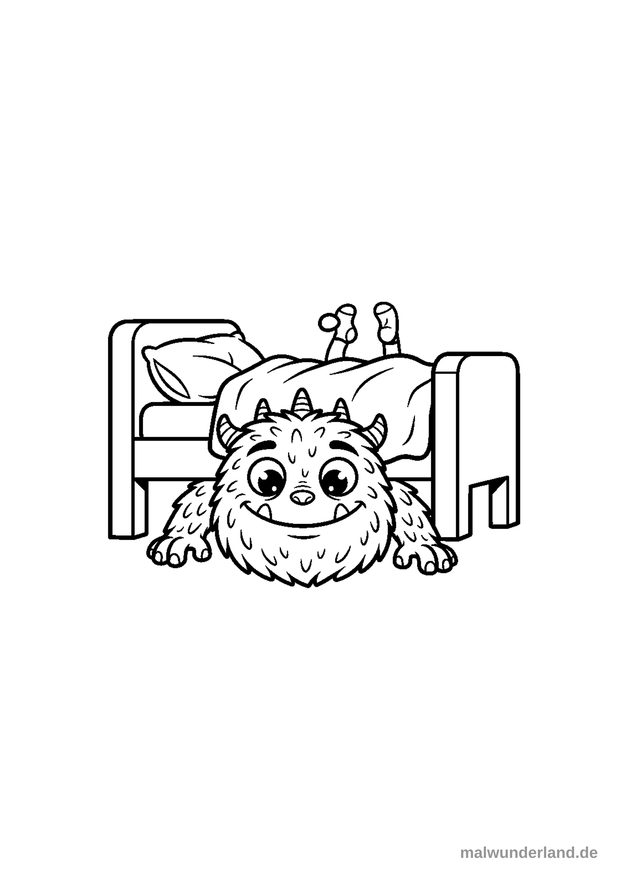 Das Ausmalbild zeigt ein niedliches, freundlich lächelndes Monster, das unter einem Bett hervorschaut. Auf dem Bett sind ein Kissen, eine Decke und die Füße einer Person mit Socken zu sehen.