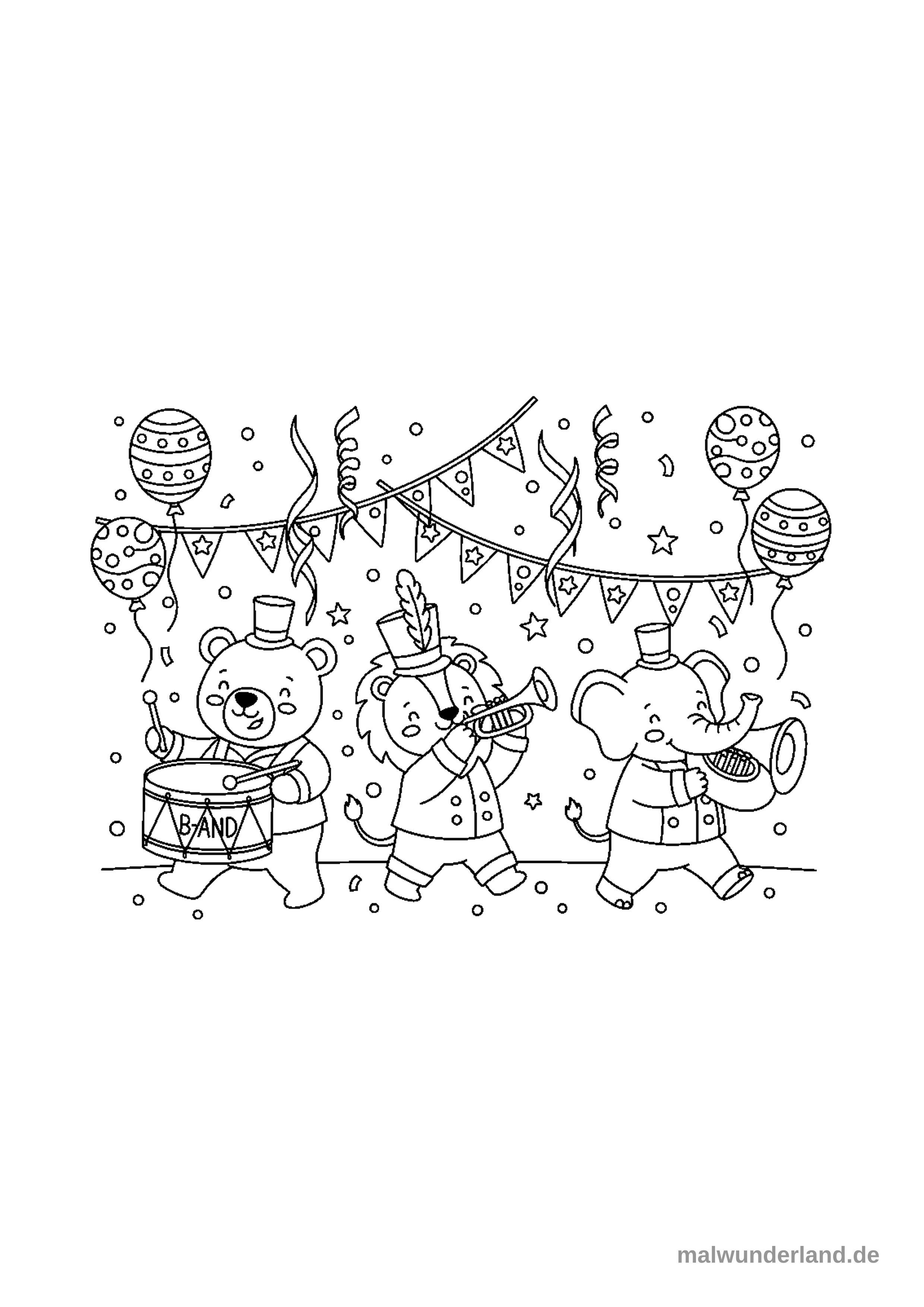 Ein Ausmalbild zeigt drei Tiere – einen Bären, einen Löwen und einen Elefanten – die als Marschkapelle musizieren und marschieren. Über ihnen schweben festliche Luftballons und bunte Wimpelketten, umgeben von Konfetti und Sternen.
