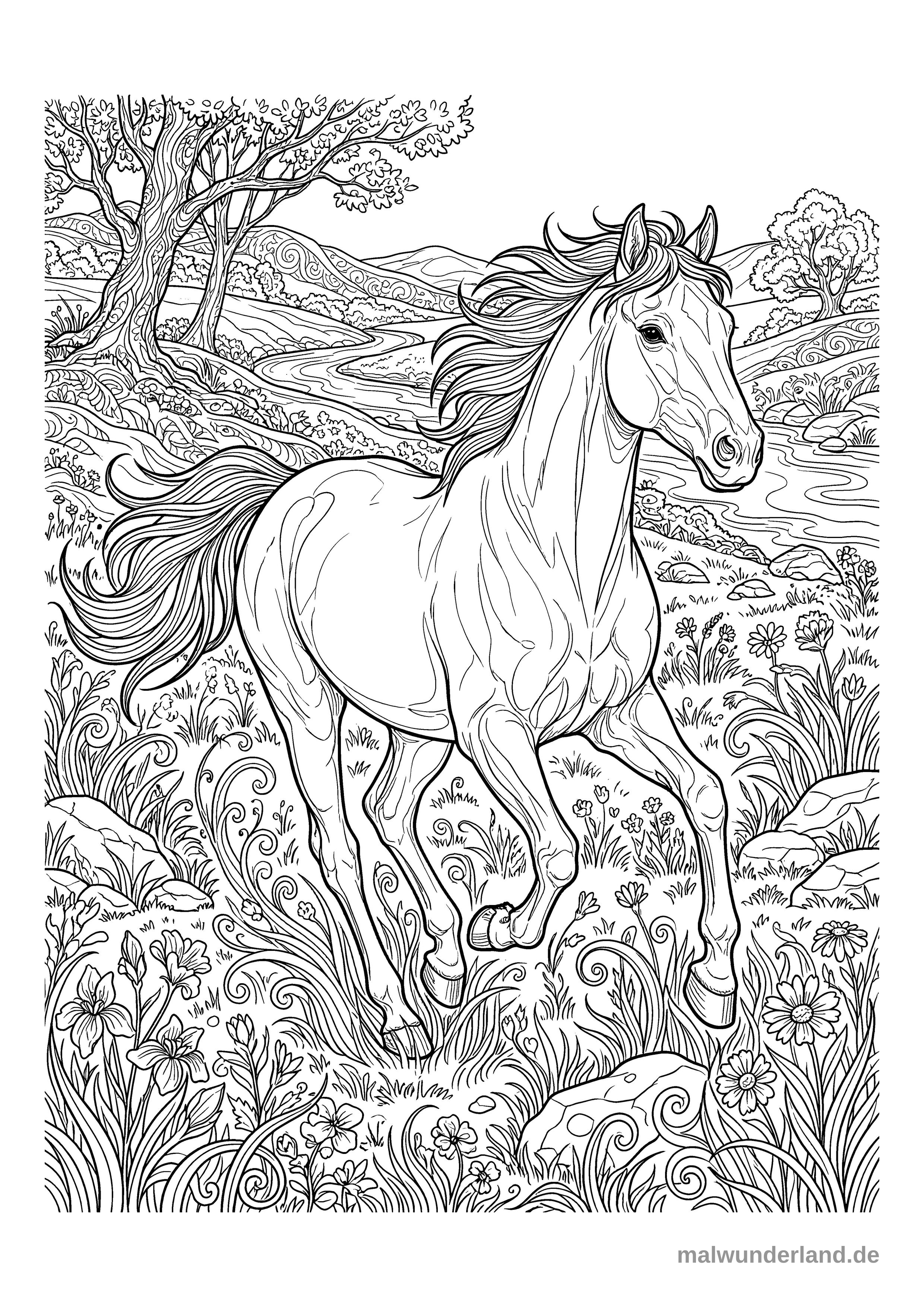 Das Ausmalbild zeigt ein detailreiches galoppierendes Pferd inmitten einer üppigen Naturlandschaft. Im Vordergrund sind verschiedene Blumen und Gräser zu sehen, während im Hintergrund ein Fluss, sanfte Hügel und Bäume die Szene umrahmen.