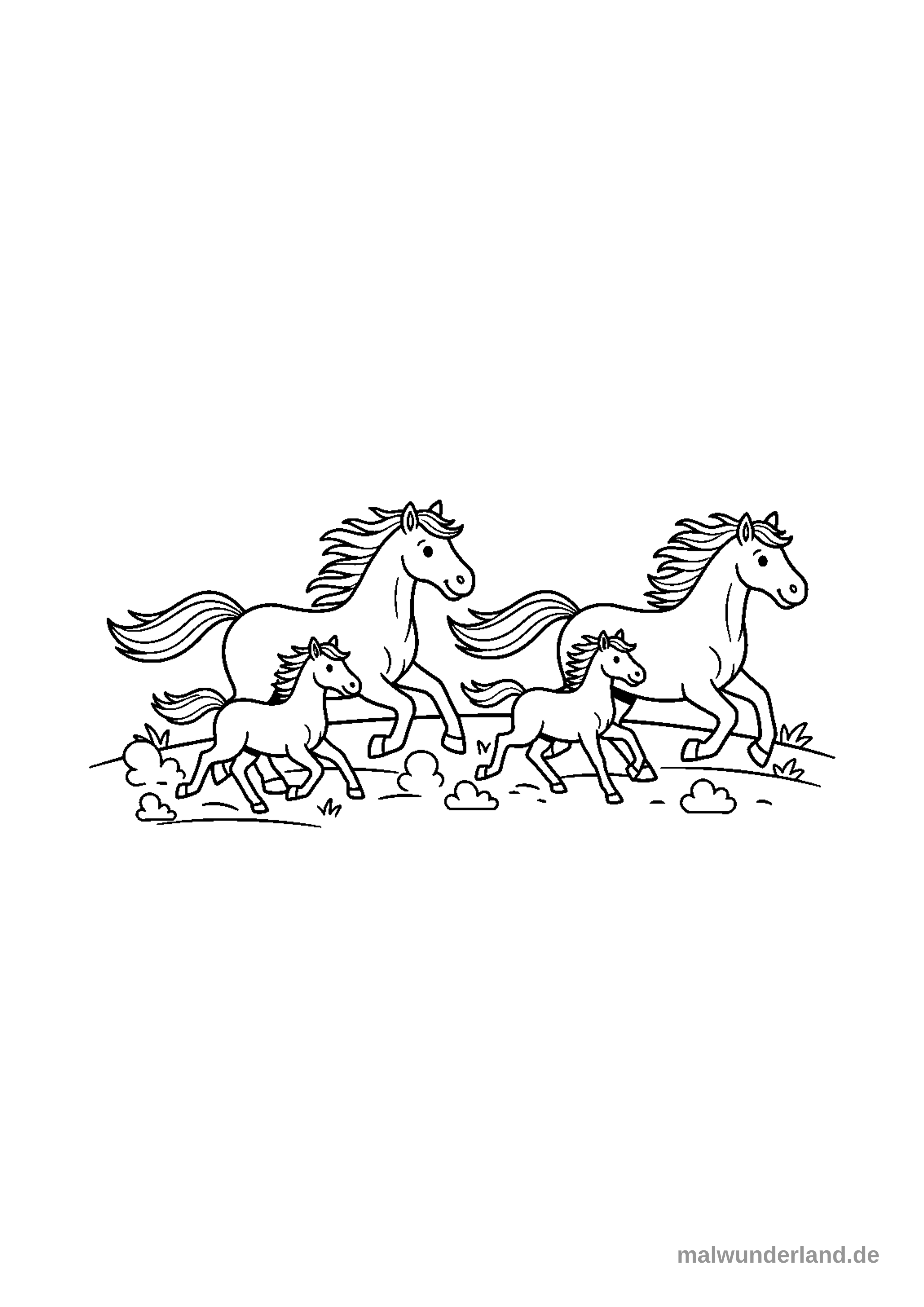 Zwei erwachsene Pferde und zwei Fohlen galoppieren von links nach rechts über eine leicht hügelige Graslandschaft. Das Ausmalbild zeigt die Tiere als Umrisszeichnungen mit wehenden Mähnen und angedeuteten Staubwolken unter ihren Hufen.