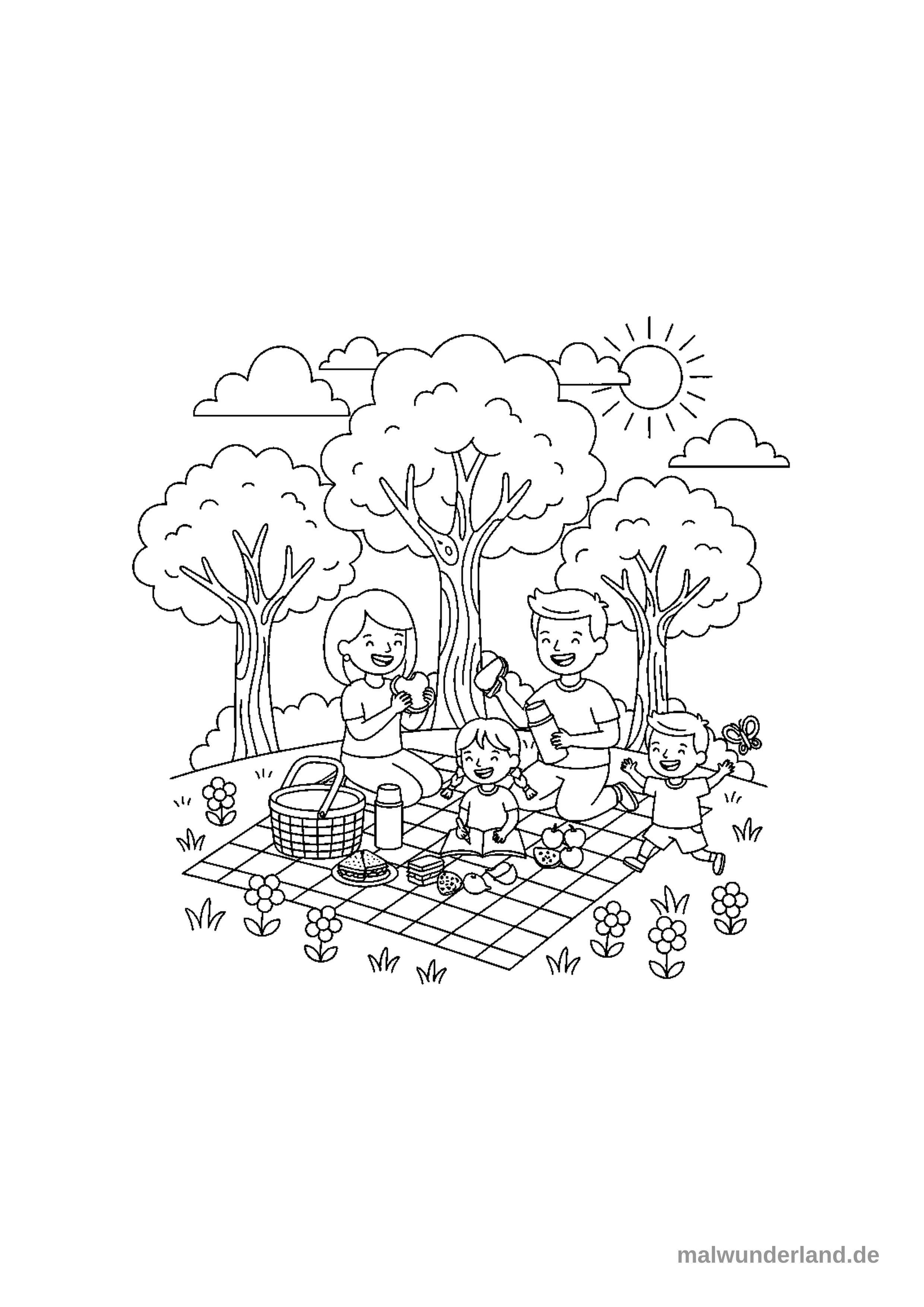 Dieses Ausmalbild zeigt eine glückliche Familie, bestehend aus Eltern und zwei Kindern, die im Park ein Picknick machen. Sie sitzen auf einer karierten Decke unter Bäumen, umgeben von Blumen und Sonnenschein.