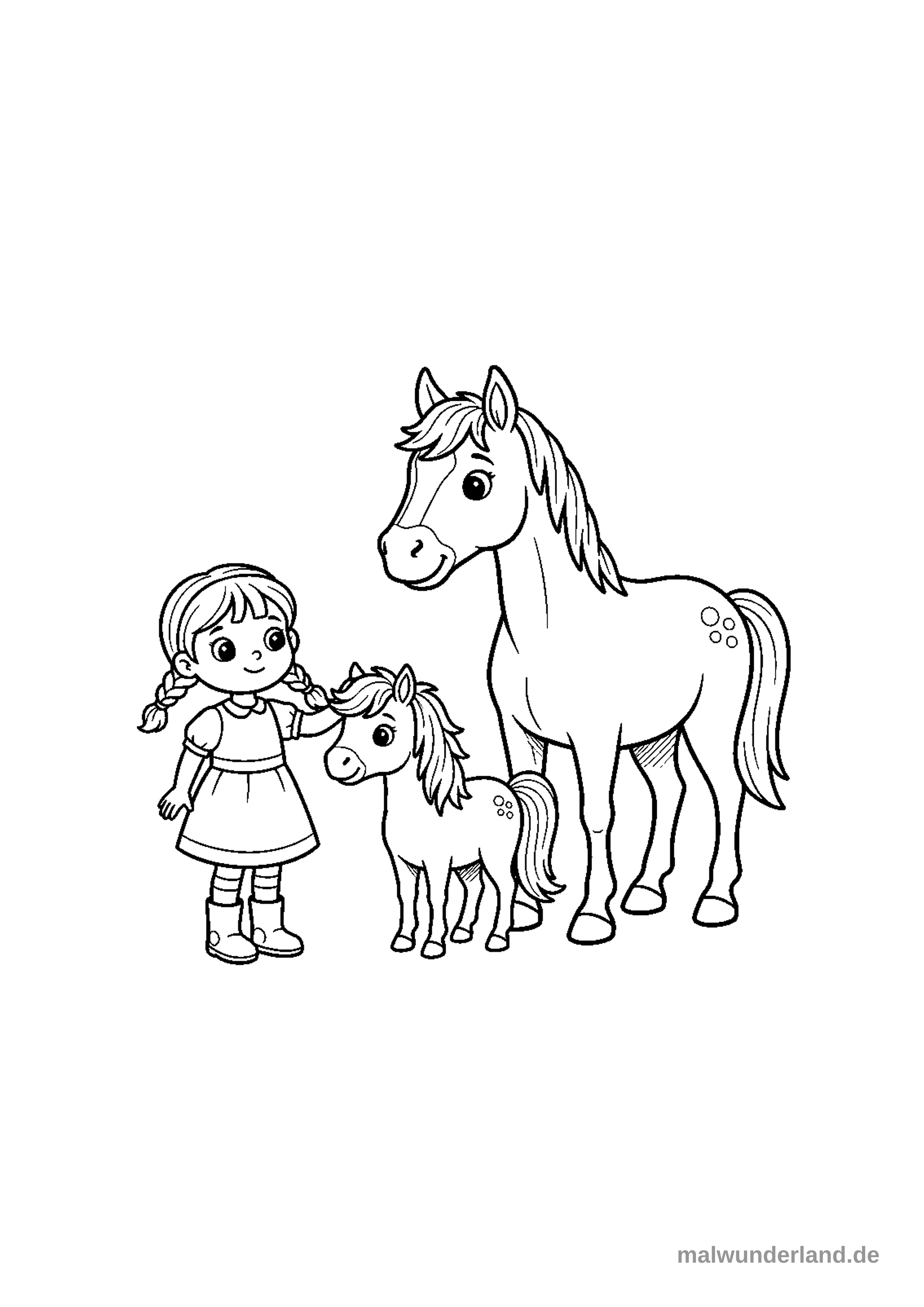 Das Ausmalbild zeigt ein kleines Mädchen mit Zöpfen und Stiefeln, das ein süßes Pony streichelt. Daneben steht ein größeres Pferd, und alle Figuren lächeln freundlich.