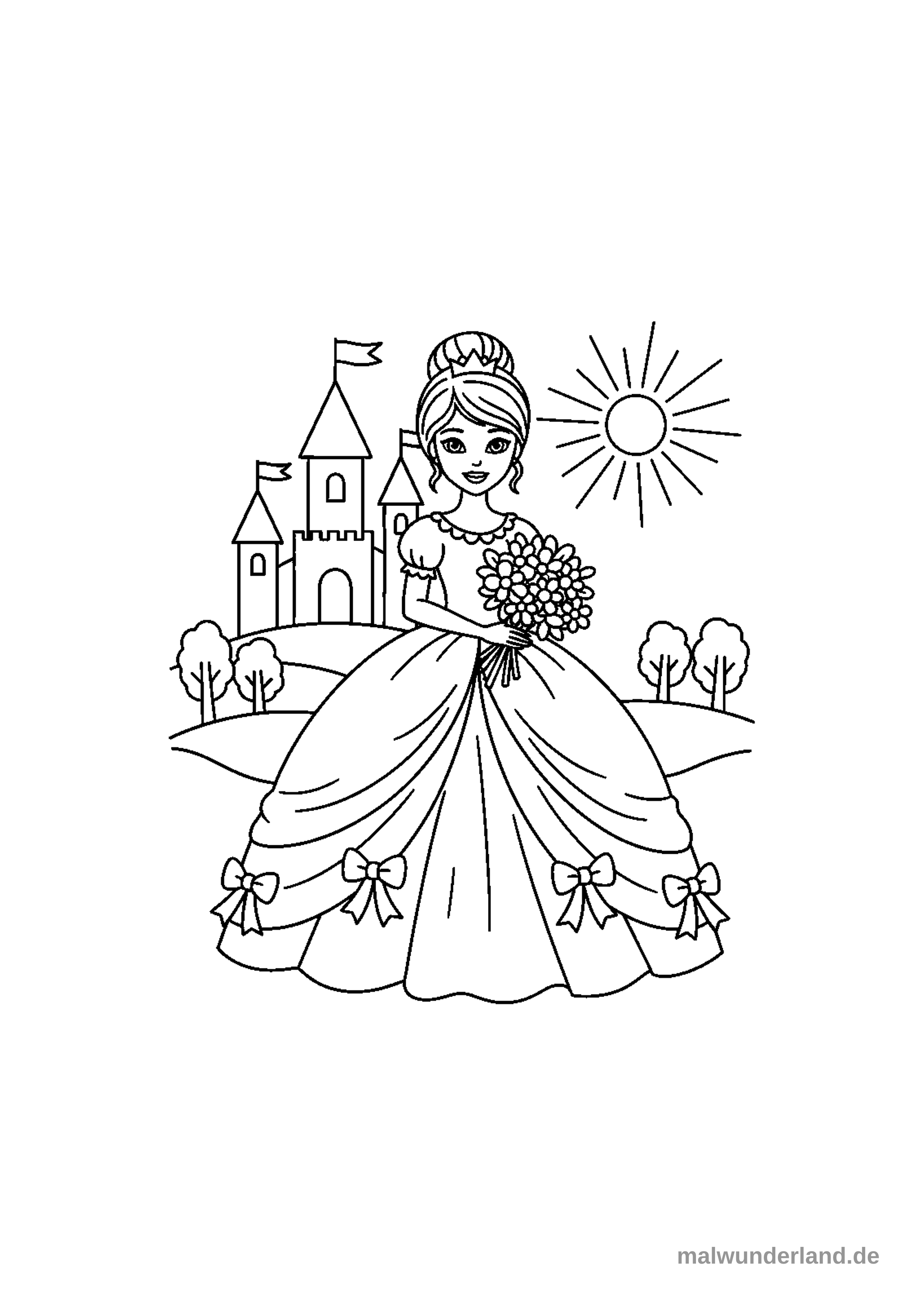 Eine lächelnde Prinzessin im prunkvollen Ballkleid, das mit Schleifen verziert ist, hält einen Blumenstrauß in den Händen. Im Hintergrund sind ein majestätisches Schloss mit Flaggen, sanfte Hügel mit Bäumen und eine strahlende Sonne am Himmel zu sehen.