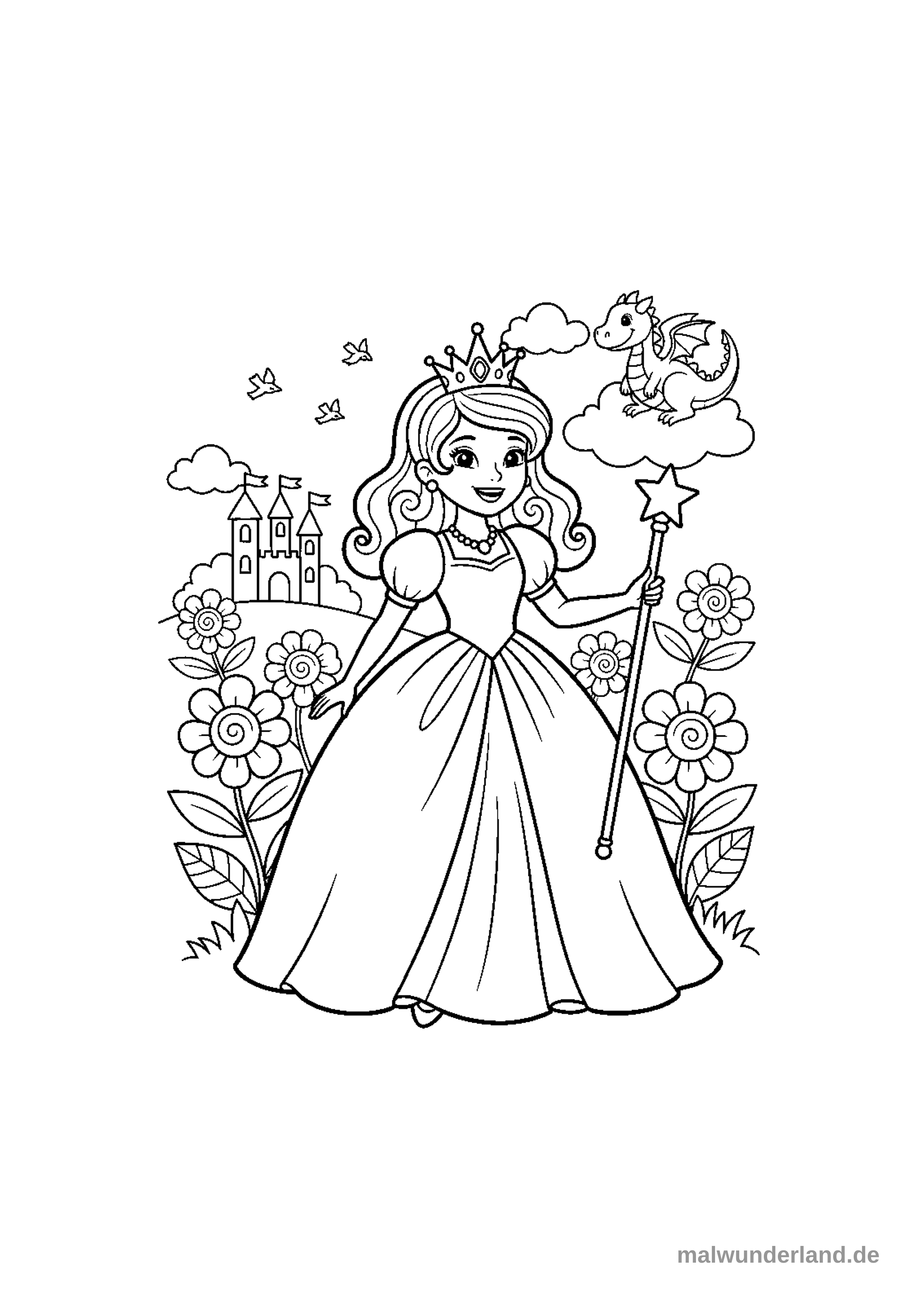 Das Ausmalbild zeigt eine lächelnde Prinzessin mit einem Diadem und einem Sternen-Zauberstab in einem langen, eleganten Kleid. Im Hintergrund sind ein Schloss auf einem Hügel, zahlreiche Blumen, fliegende Vögel und ein kleiner Drache auf einer Wolke zu sehen.