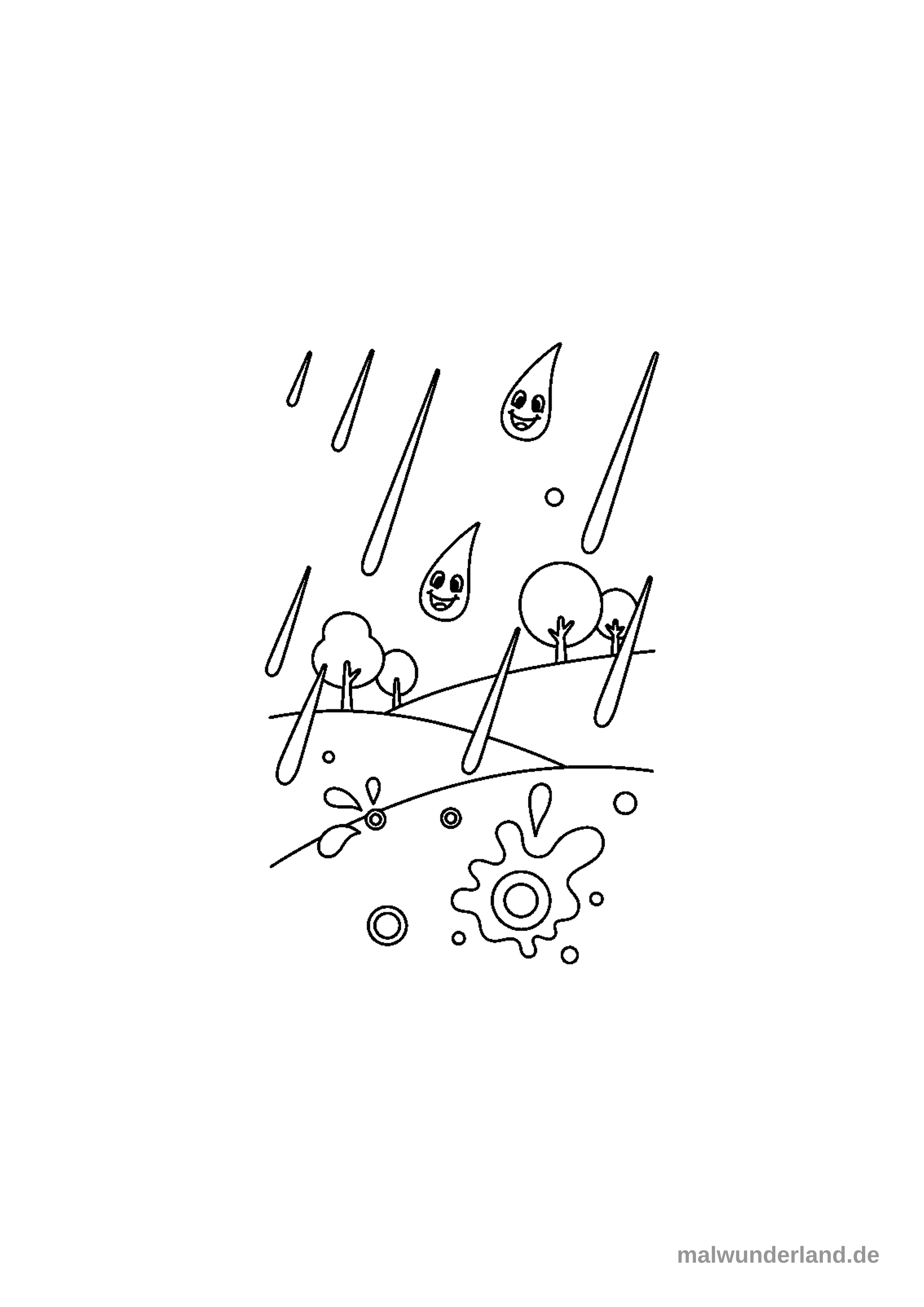 Das Bild zeigt ein Ausmalbild mit fallenden Regentropfen, einige davon mit Gesichtern, über einer hügeligen Landschaft mit einfachen Bäumen. Auf dem Boden sind verschiedene Wasserspritzer und kleine Kreise zu sehen, die auf den Aufprall der Tropfen hindeuten.