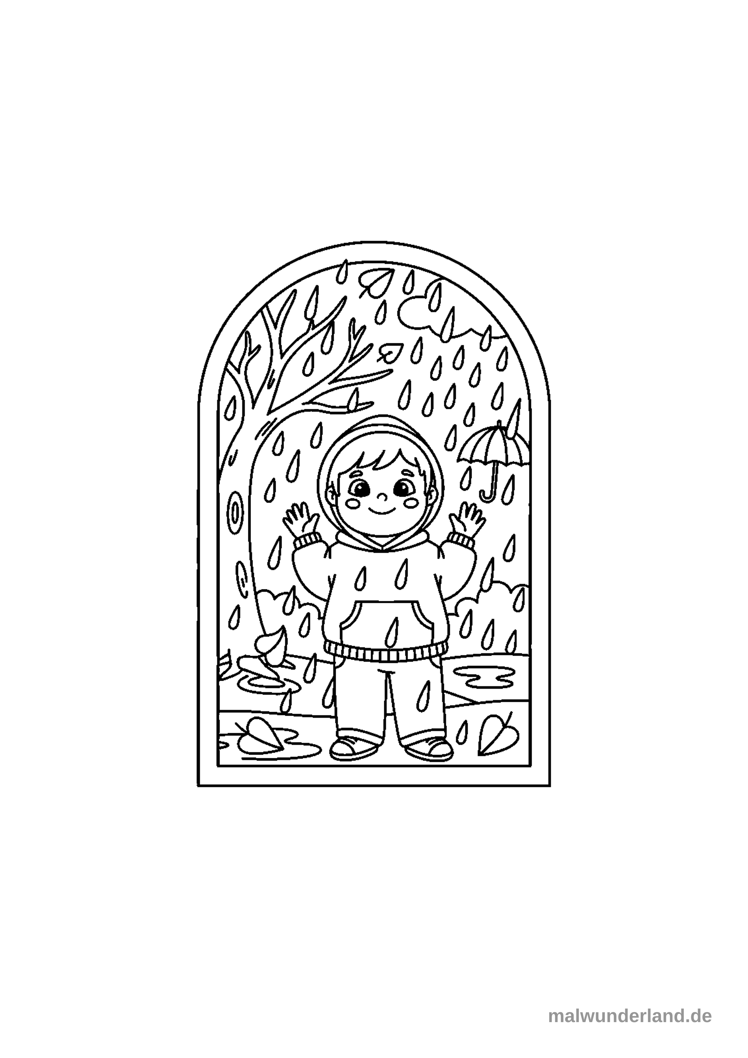 Das Ausmalbild zeigt ein fröhliches Kind in einem Kapuzenpullover, das im Regen steht und die Hände nach oben streckt. Die Szene, umgeben von einem kahlen Baum, herabfallenden Blättern, Pfützen und einem kleinen Regenschirm, ist durch einen Bogen gerahmt.