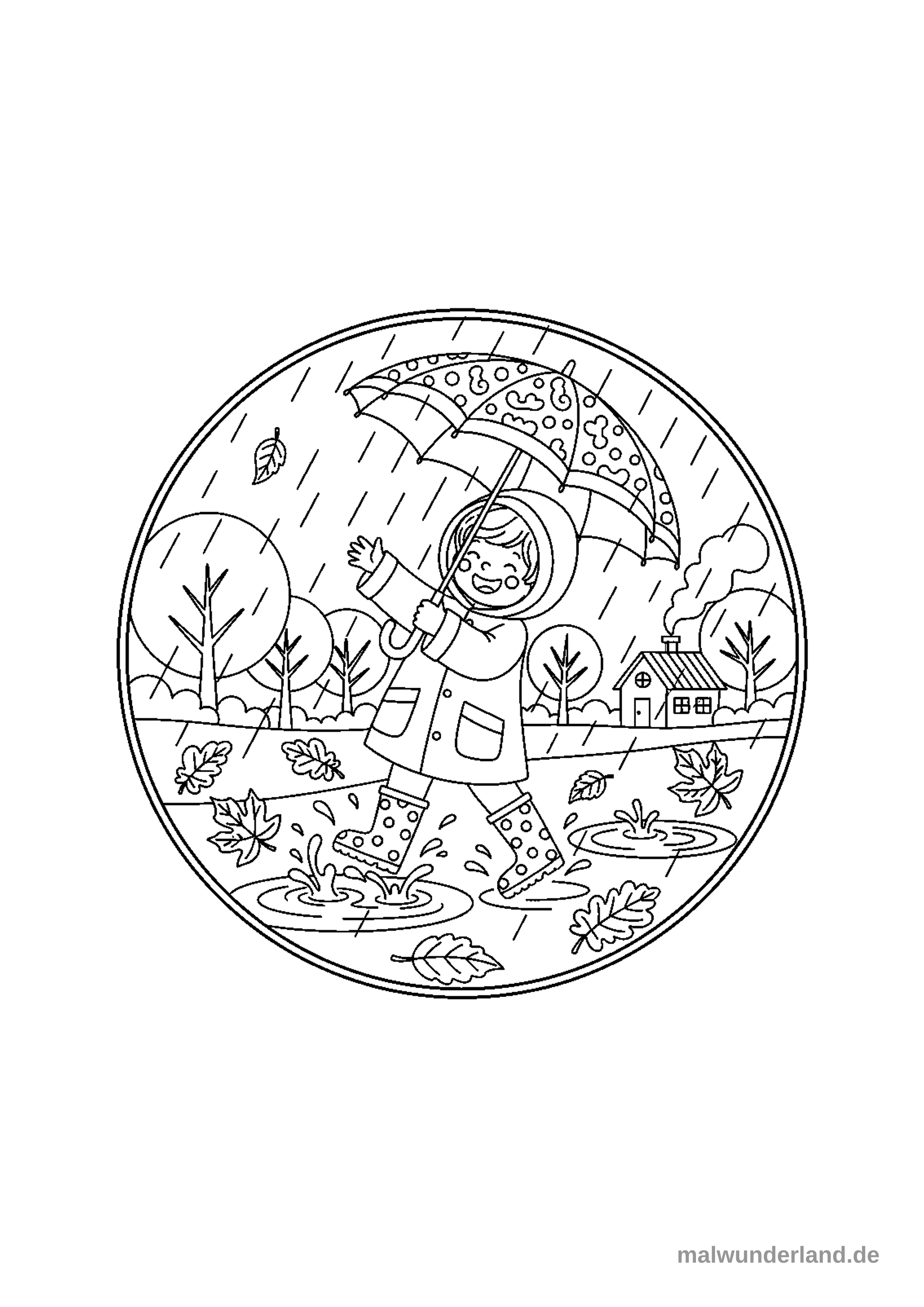 Ein fröhliches Kind in Regenmantel und Gummistiefeln läuft mit einem geöffneten Regenschirm durch eine regnerische Herbstlandschaft und planscht in Pfützen. Im Hintergrund sind Bäume und ein kleines Haus mit rauchendem Schornstein zu sehen, alles umrahmt von einem Kreis.