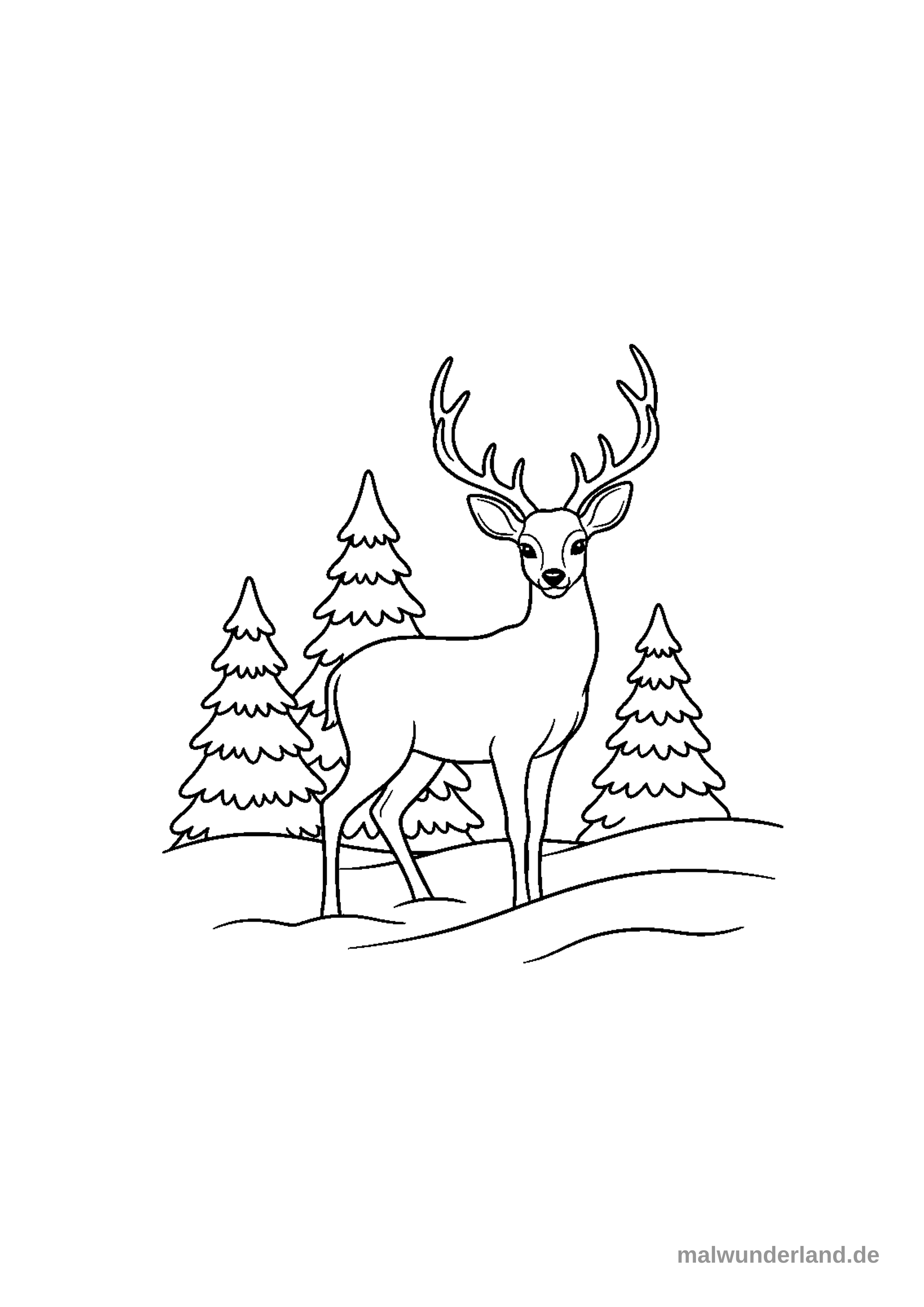 Das Ausmalbild zeigt ein Reh mit großem Geweih, das auf einem verschneiten Hügel steht. Im Hintergrund sind mehrere winterliche Tannenbäume zu sehen.