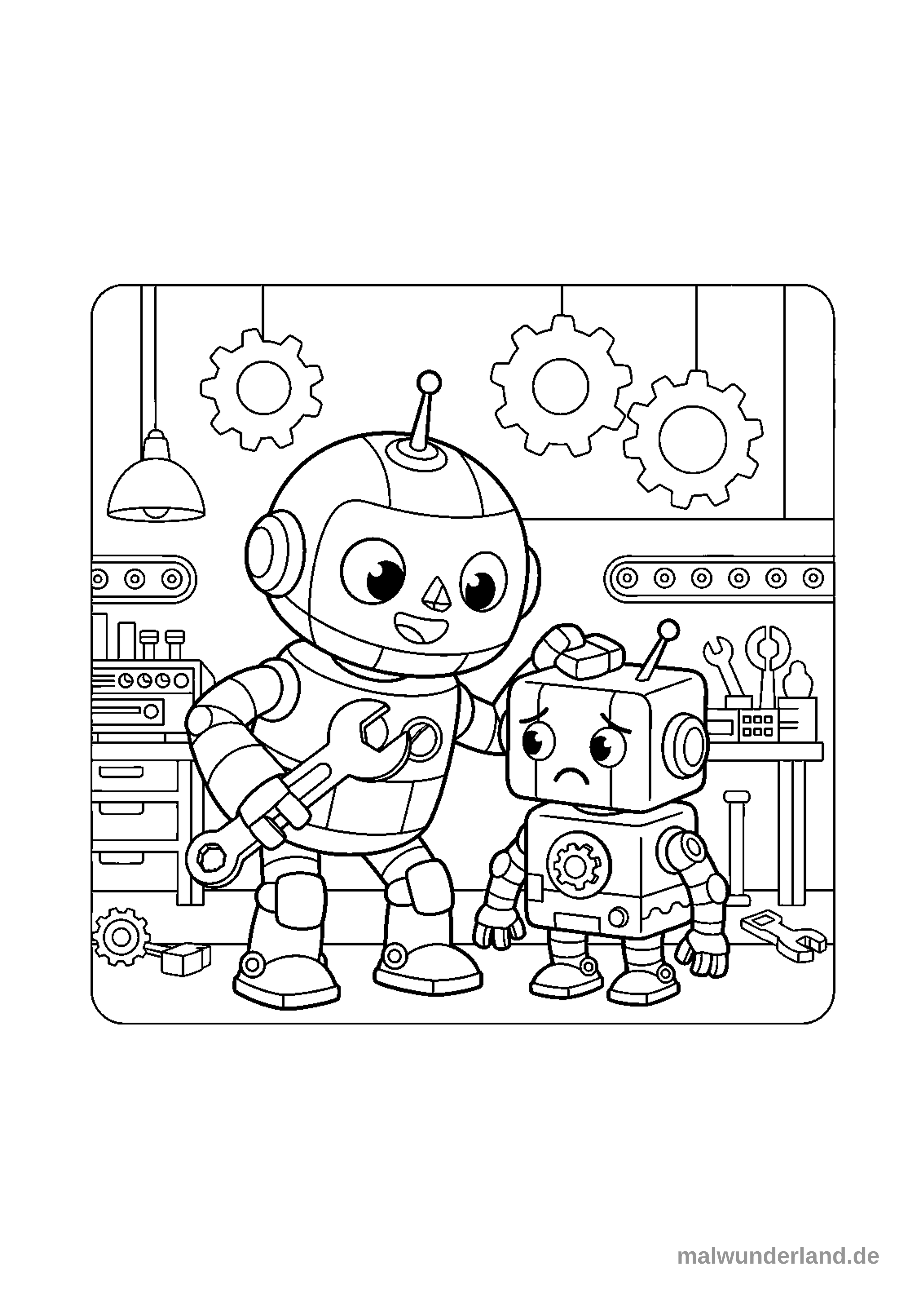 Das Ausmalbild zeigt zwei Roboter in einer geschäftigen Werkstatt. Ein größerer, lächelnder Roboter hält einen Schraubenschlüssel und legt fürsorglich eine Hand auf den Kopf eines kleineren, traurig blickenden Roboters.