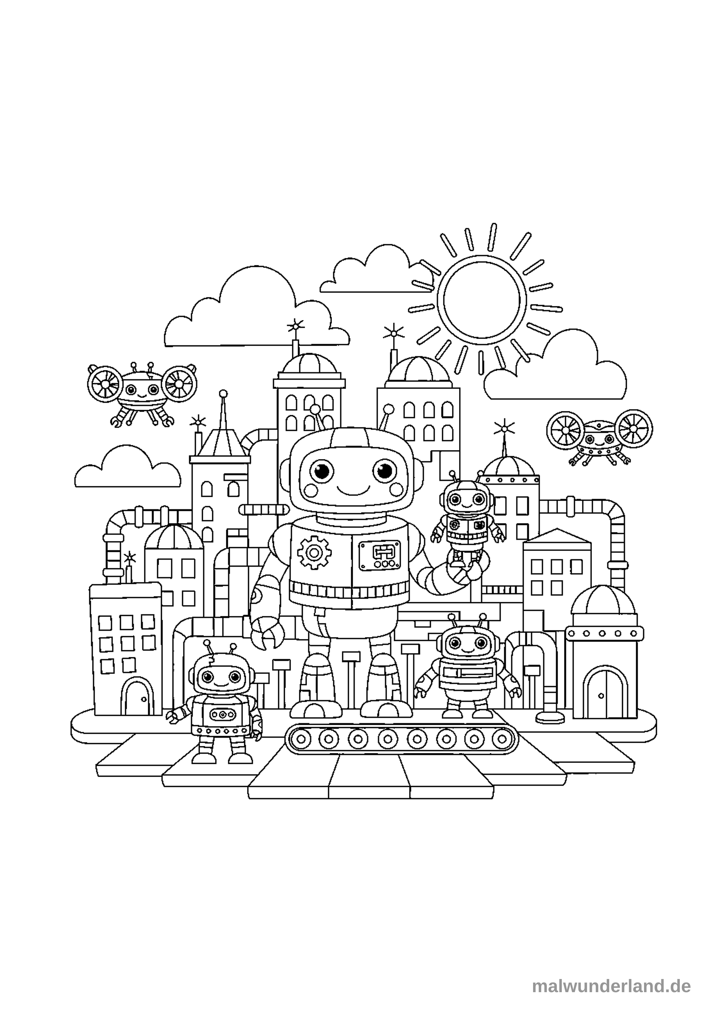 Das Ausmalbild zeigt eine freundliche Roboterfamilie in einer lebhaften Roboter-Stadt. Ein großer Roboter hält einen kleineren Roboter, während zwei weitere kleine Roboter auf einer Plattform stehen, umgeben von futuristischen Gebäuden, fliegenden Drohnen, Wolken und einer strahlenden Sonne.