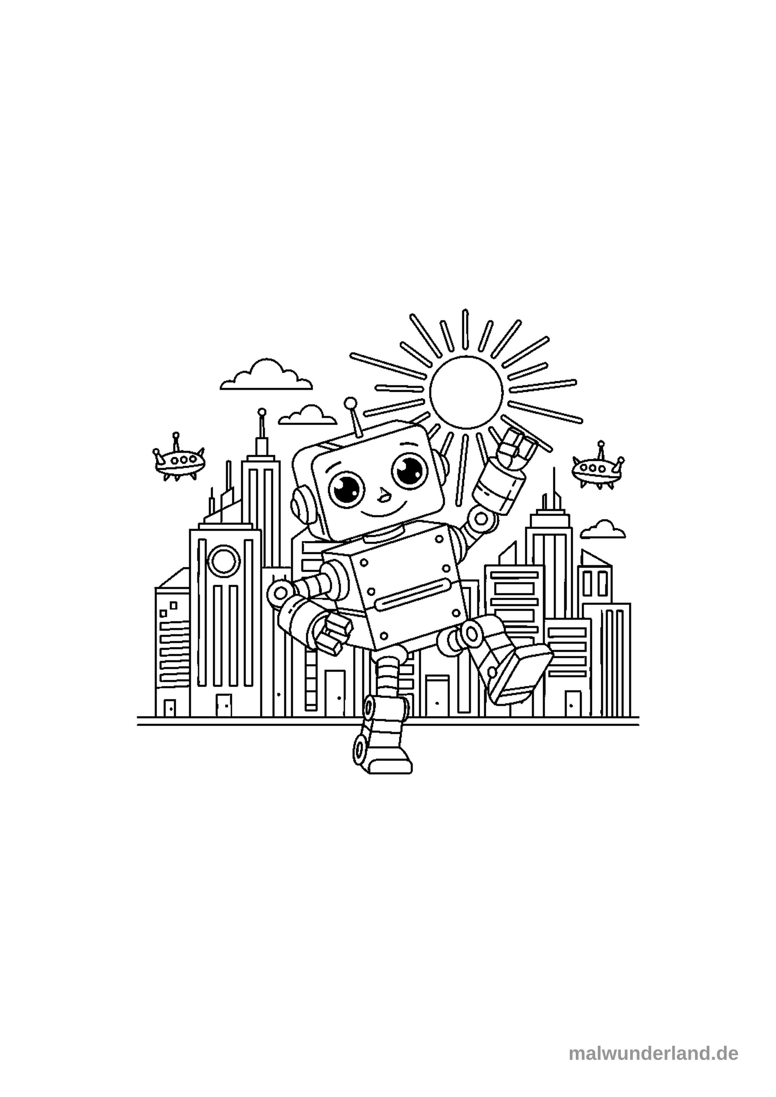Das Bild zeigt einen fröhlichen Roboter, der in einer Stadtlandschaft vor hohen Gebäuden tanzt oder winkt. Im Hintergrund sind eine lächelnde Sonne, Wolken und zwei kleine fliegende Untertassen zu sehen.