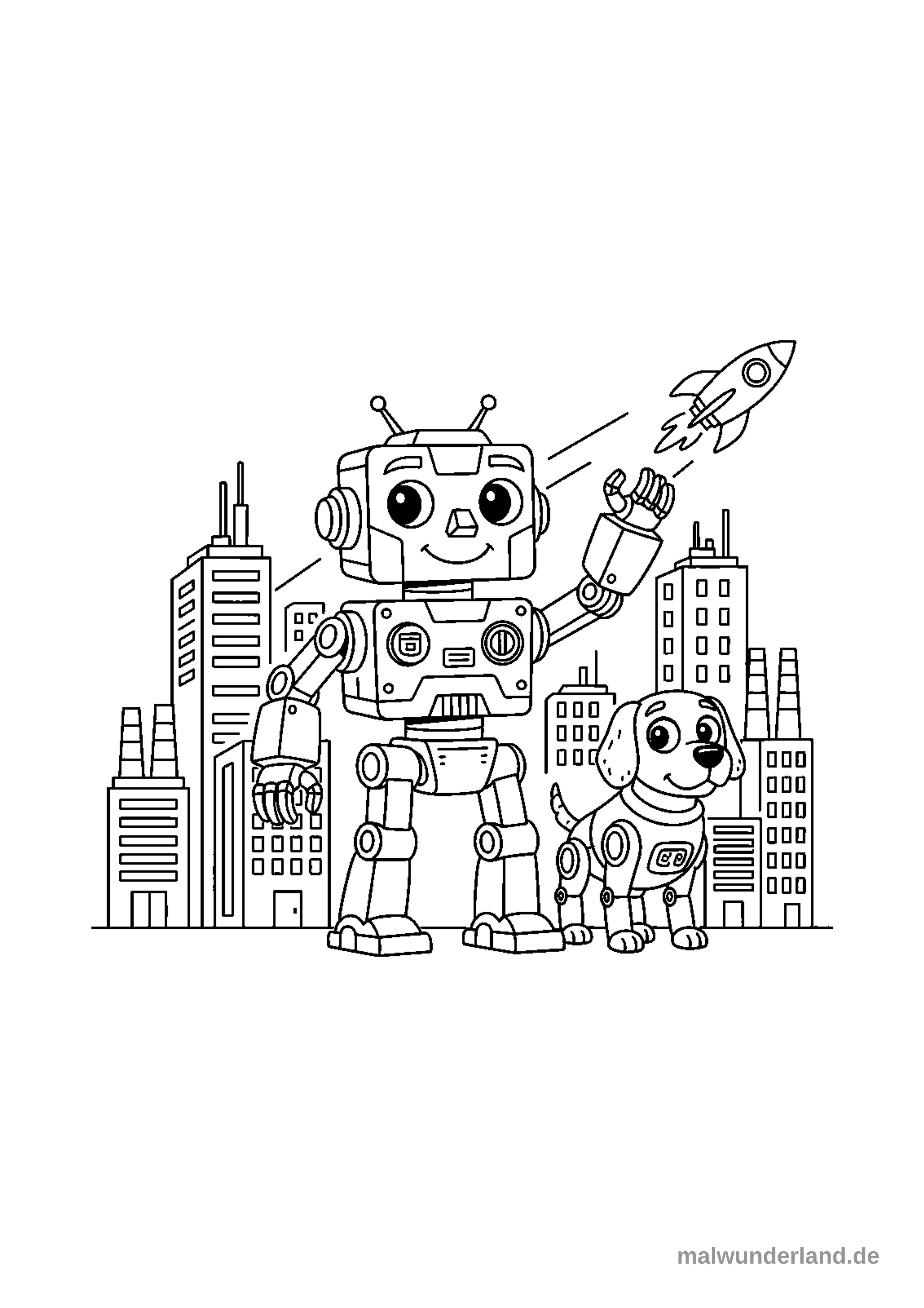 Das Ausmalbild zeigt einen großen, freundlichen Roboter und seinen kleineren Roboterhund, die in einer Stadtkulisse stehen. Im Hintergrund erheben sich verschiedene Gebäude, während eine Rakete in den Himmel aufsteigt.