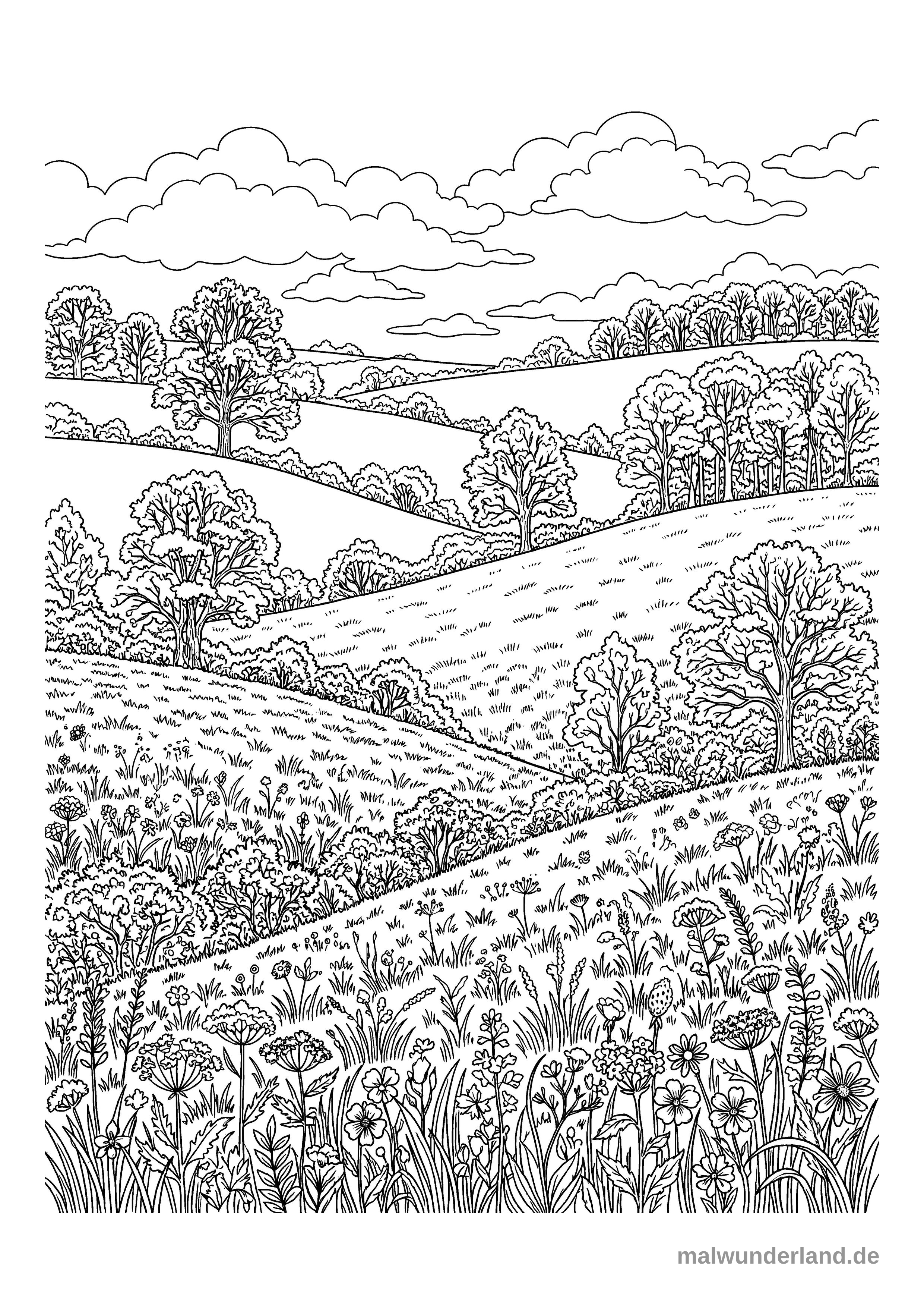 Das Ausmalbild zeigt eine weite, detaillierte Hügellandschaft, die mit Bäumen, Sträuchern und weiten Wiesen bedeckt ist. Im Vordergrund sind zahlreiche Wildblumen und Gräser zu sehen, während sich am Himmel verschiedene Wolken befinden.