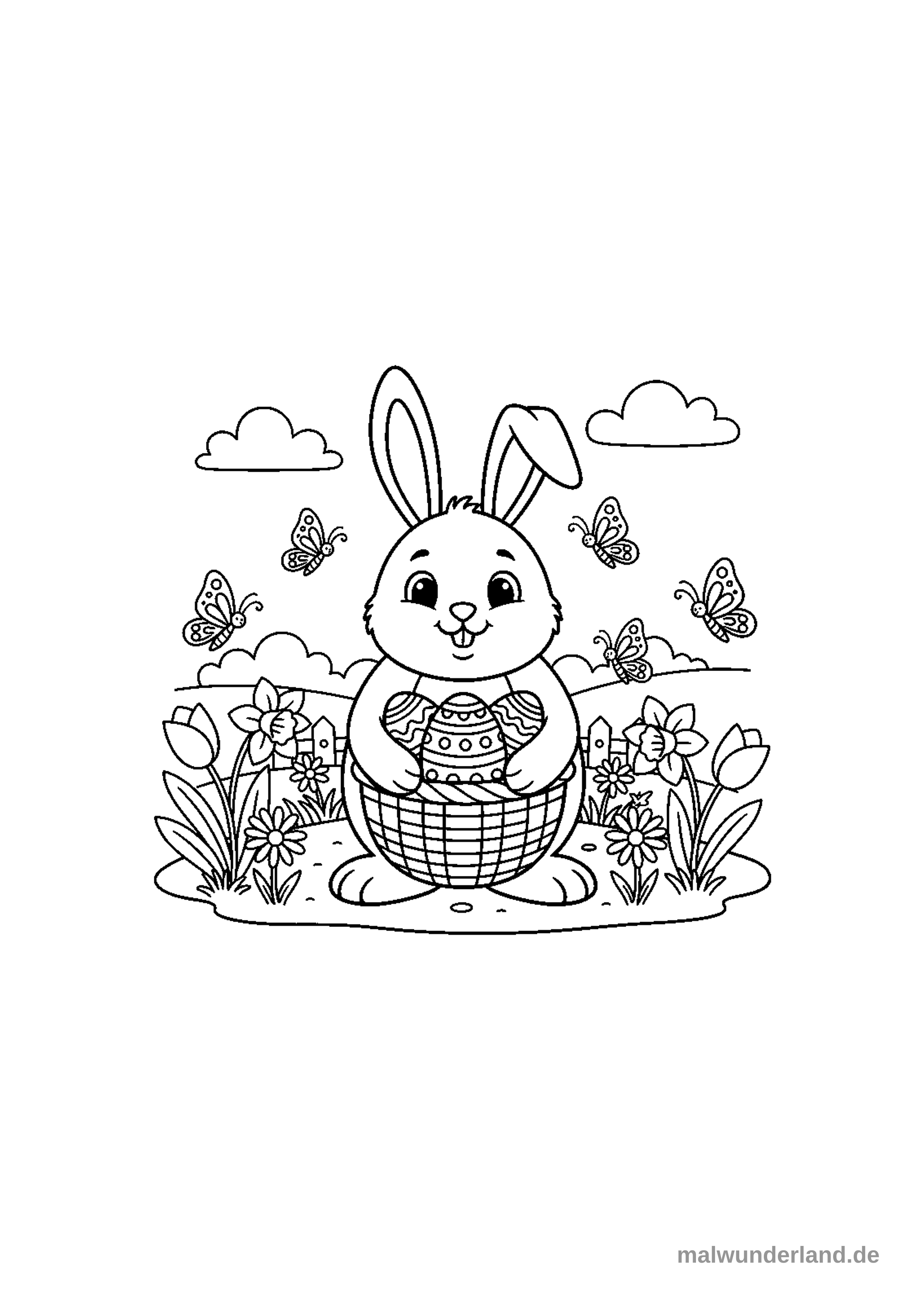 Das Ausmalbild zeigt einen niedlichen Osterhasen, der in einer frühlingshaften Landschaft steht und einen Korb voller Ostereier hält. Um ihn herum fliegen fünf Schmetterlinge, während im Vordergrund verschiedene Blumen und Gräser wachsen.
