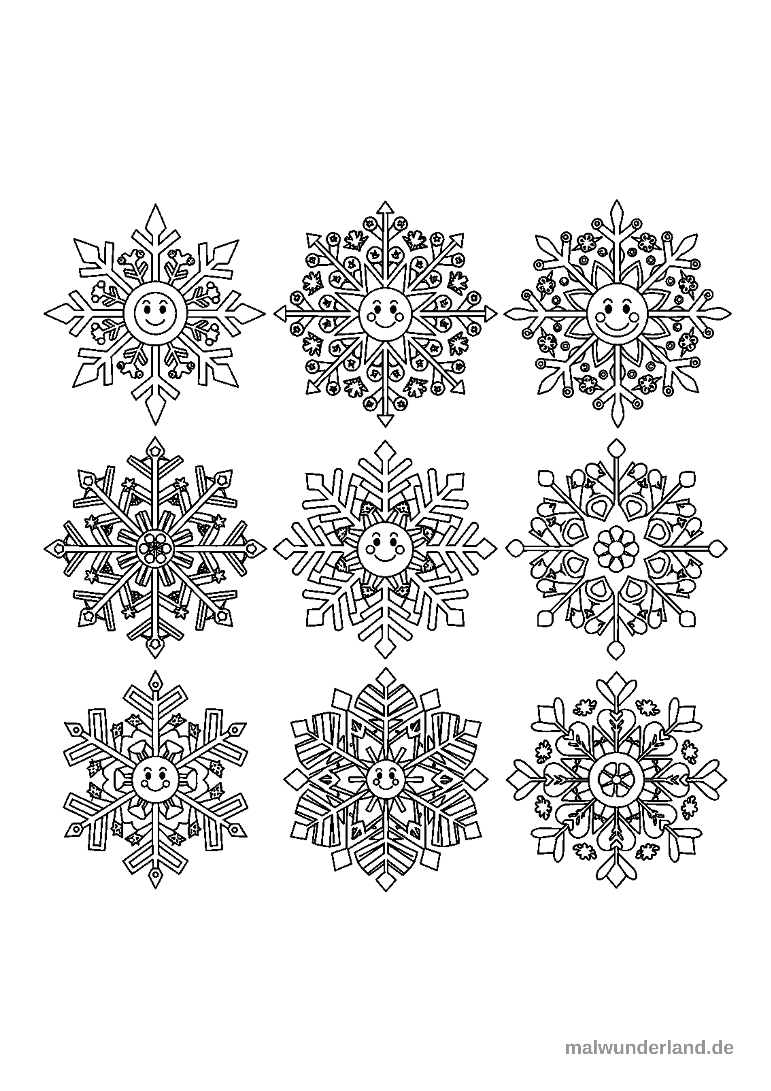Das Bild zeigt neun verschiedene Schneeflocken-Muster, die in einem 3x3-Raster angeordnet sind. Einige Schneeflocken haben in ihrer Mitte ein lächelndes Gesicht, während andere rein geometrisch gestaltet sind, alle als Ausmalvorlage.