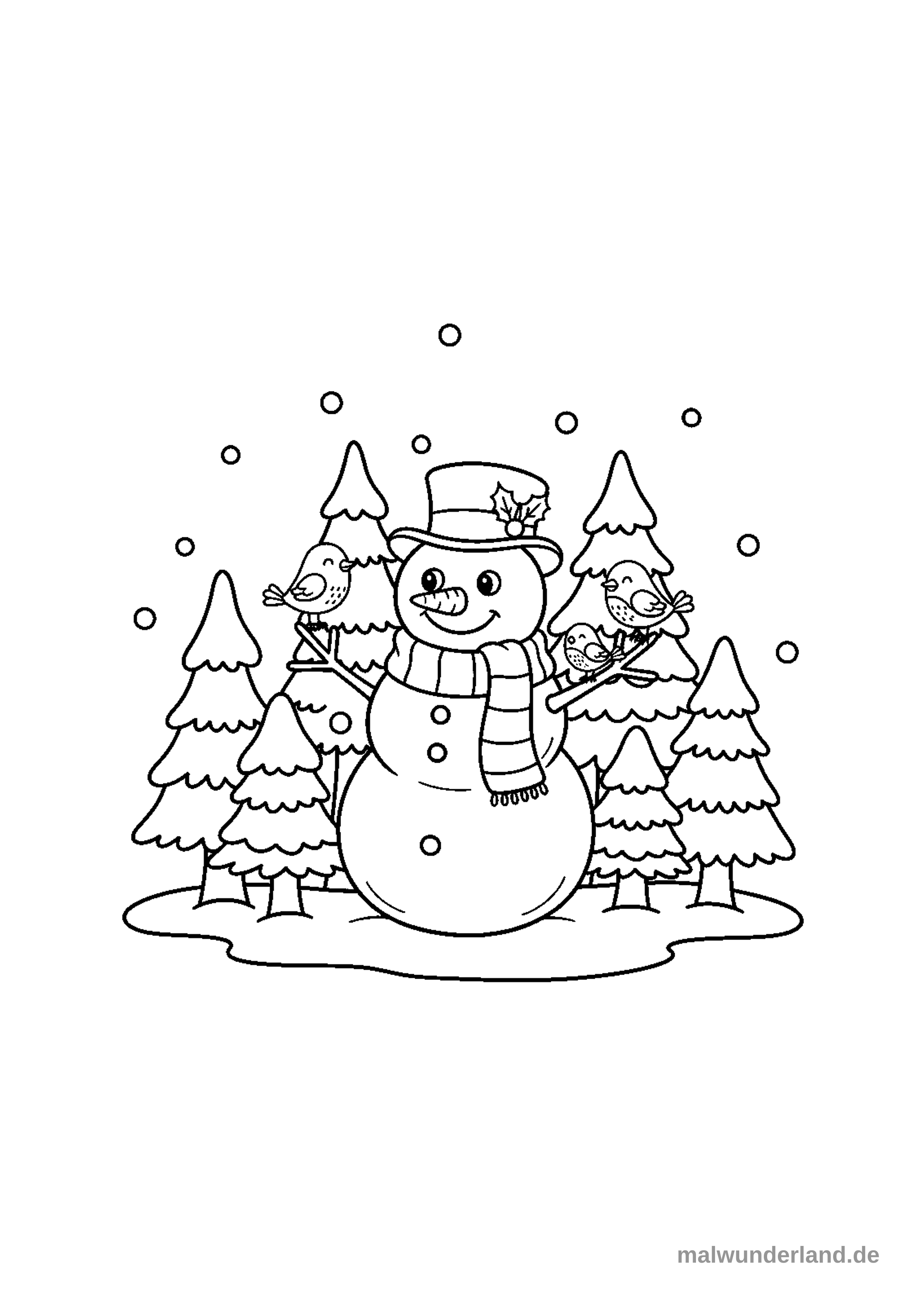 Ein lächelnder Schneemann mit Zylinder, Schal und Karottennase steht im Zentrum, umgeben von mehreren Tannenbäumen. Es schneit und drei kleine Vögel sitzen auf seinen Astarmen.