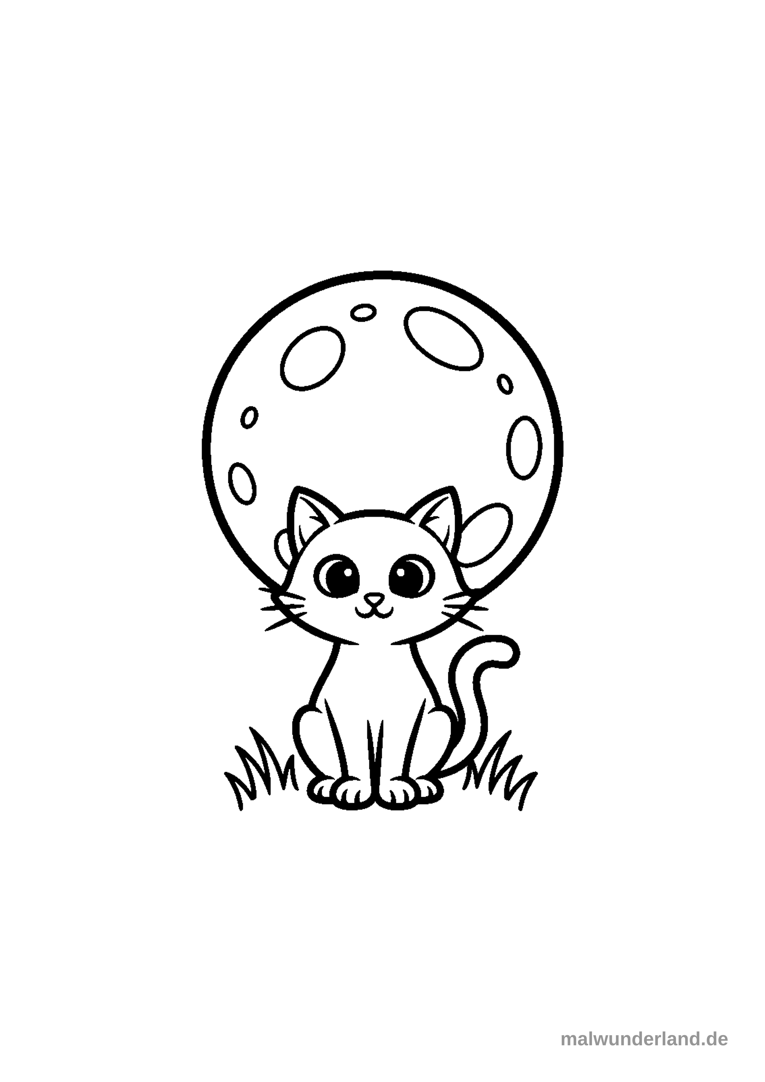 Das Ausmalbild zeigt eine niedliche Comic-Katze, die auf dem Boden sitzt und nach vorne schaut. Hinter der Katze ist ein großer, runder Mond mit mehreren kleinen und großen Kratern zu sehen, und unter ihr wächst etwas Gras.