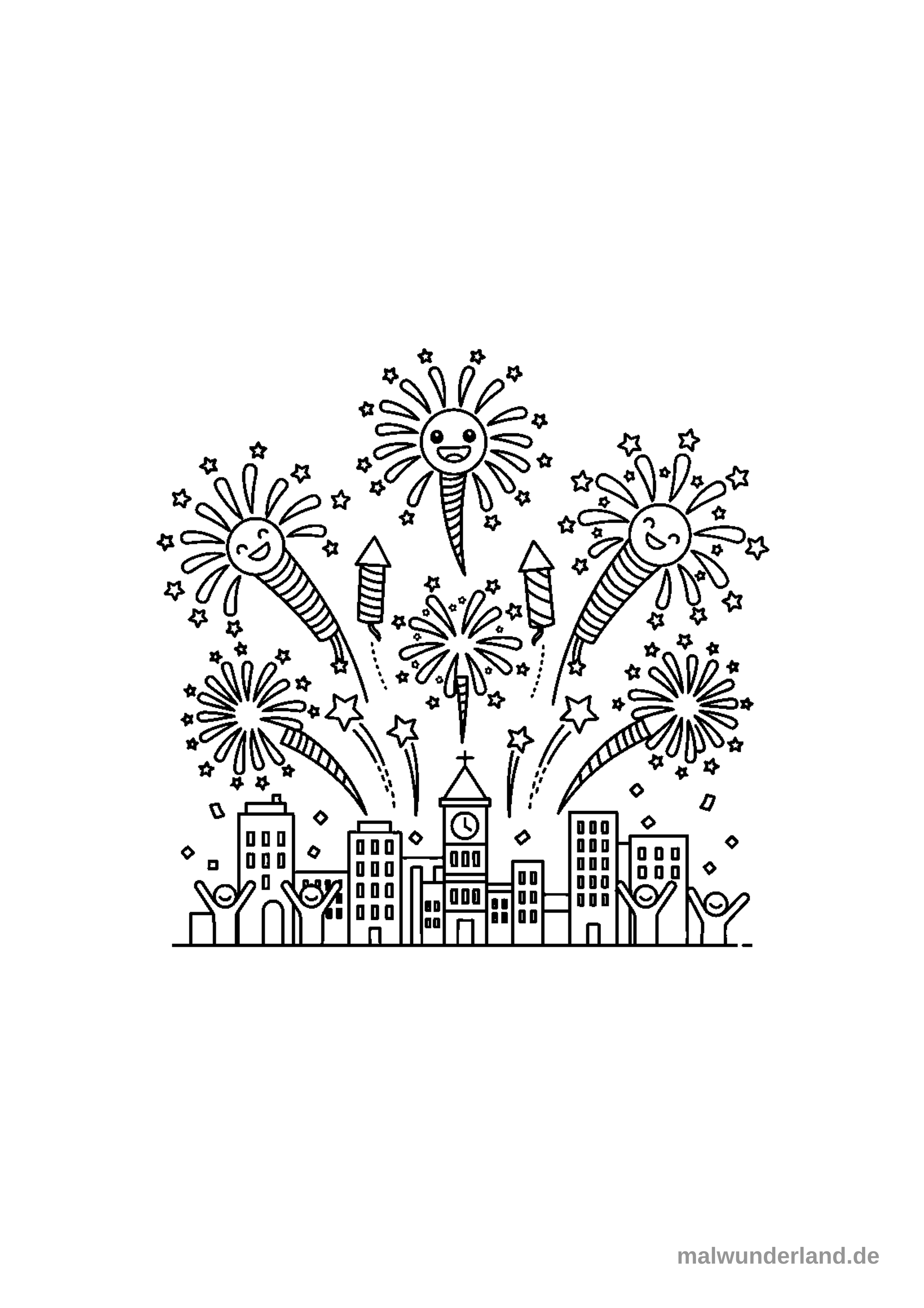 Male die lachenden Feuerwerkskörper in leuchtenden Farben wie Rot, Gelb und Grün. Die Gesichter könnten hellgelb sein. Die kleinen Sterne und die Bahnen des Feuerwerks kannst du in glitzerndem Silber oder Gold ausmalen. Die Gebäude der Stadt könnten in verschiedenen Brauntönen oder Grau gehalten werden, aber die Fenster leuchten in einem warmen Gelb. Die jubelnden Menschen am unteren Bildrand könnten bunte Kleidung in ihren Lieblingsfarben tragen.