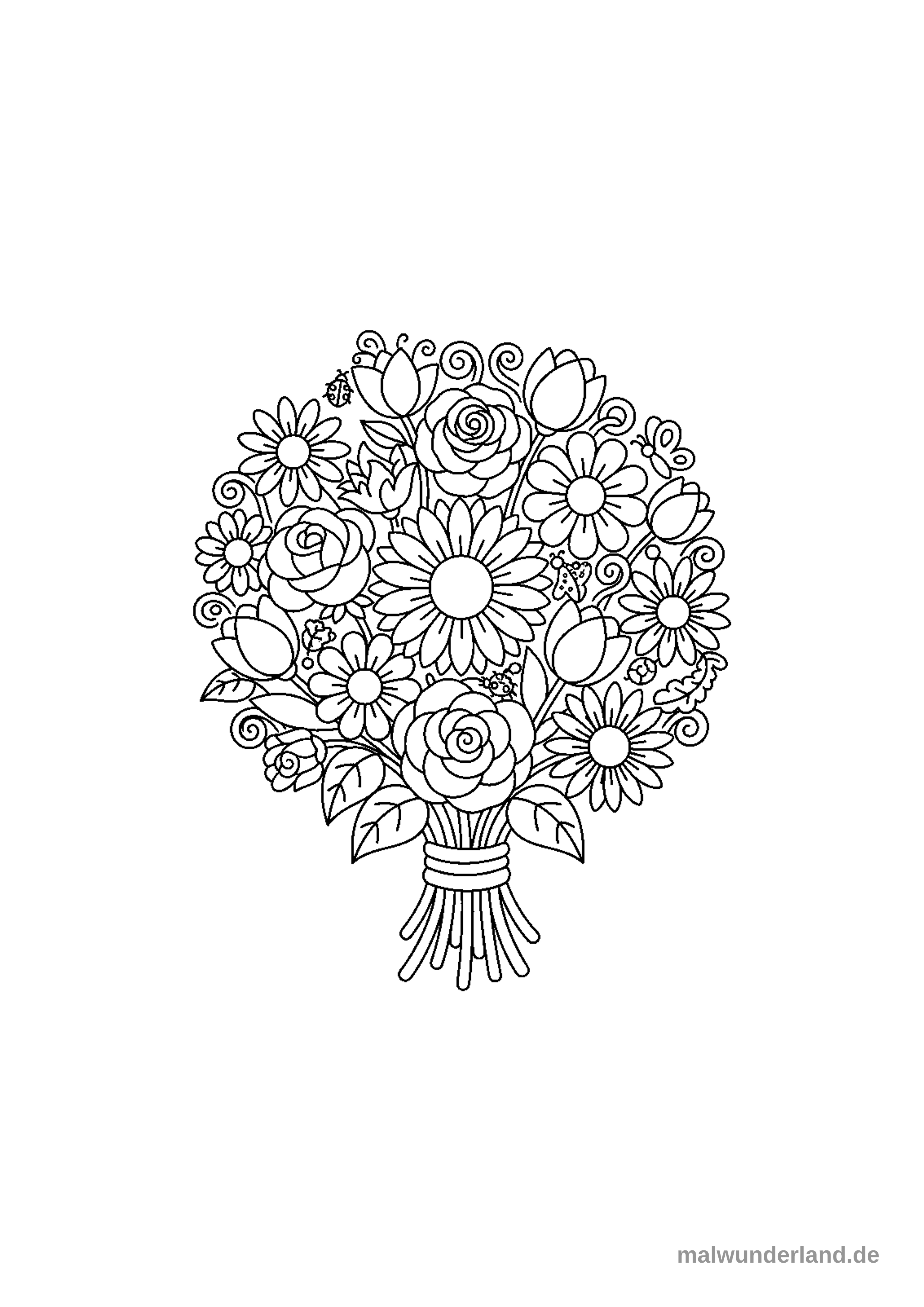 Das Bild zeigt einen runden Blumenstrauß als Ausmalbild, der verschiedene Blumen wie Rosen, Margeriten und Tulpenknospen enthält. Kleine Details wie Marienkäfer, ein Schmetterling und zarte Ranken ergänzen das Arrangement, dessen Stiele unten zusammengebunden sind.