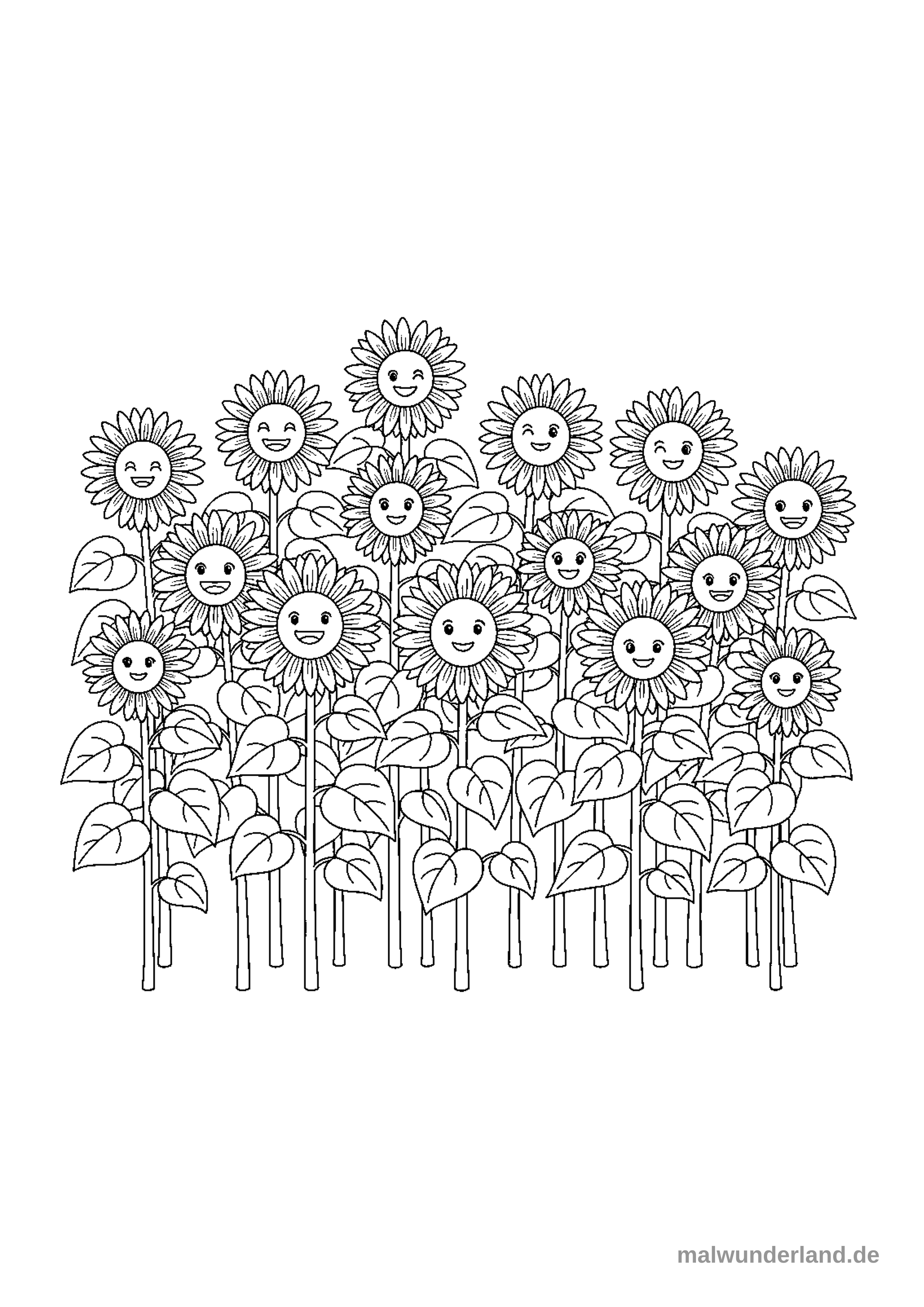 Das Ausmalbild zeigt ein dichtes Feld von stilisierten Sonnenblumen in verschiedenen Größen. Jede Sonnenblume hat ein fröhliches Gesicht mit einem Lächeln, einem Augenzwinkern oder einem geöffneten Mund.