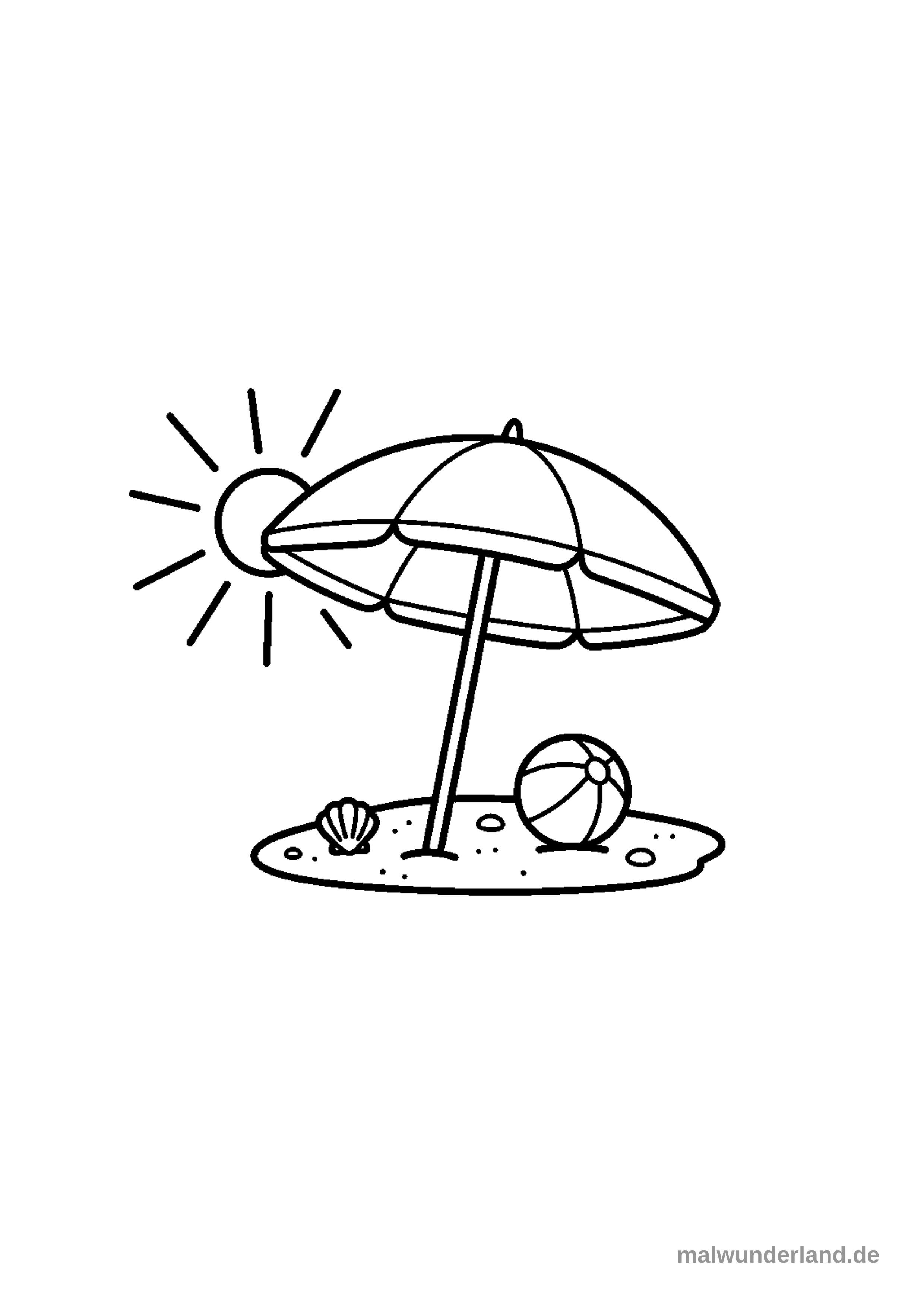 Das Ausmalbild zeigt eine idyllische Strandszene mit einem großen, geöffneten Sonnenschirm, der auf einem Sandhaufen steht. Daneben sind eine kleine Muschel und ein Wasserball zu sehen, während die Sonne mit strahlenden Strahlen am Himmel lacht.