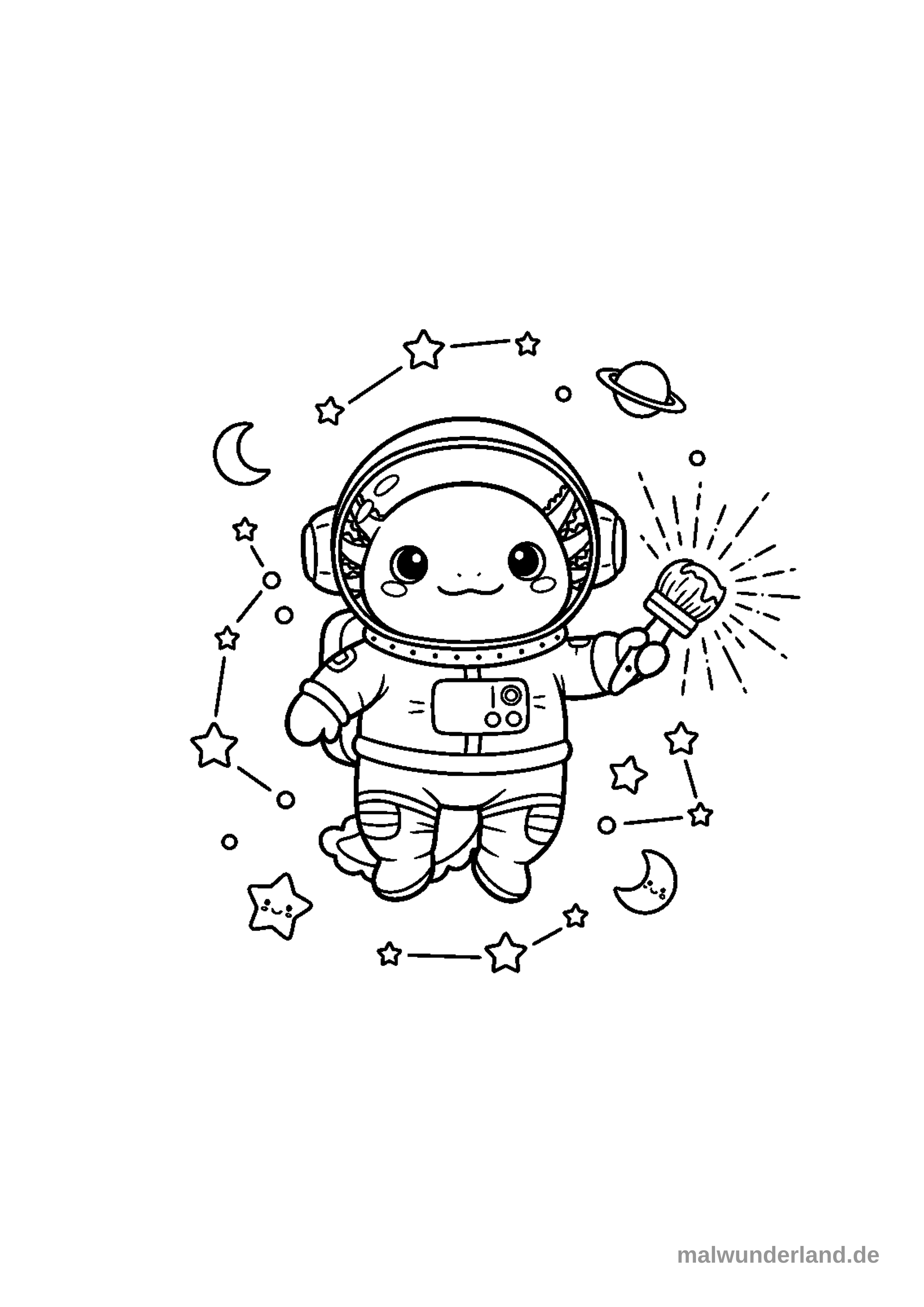 Das Ausmalbild zeigt ein niedliches Axolotl in einem Astronautenanzug, das im Weltraum schwebt und einen leuchtenden Pinsel hält. Um das Axolotl herum sind Sterne, verbundene Sternbilder, Monde und ein Ringplanet dargestellt.