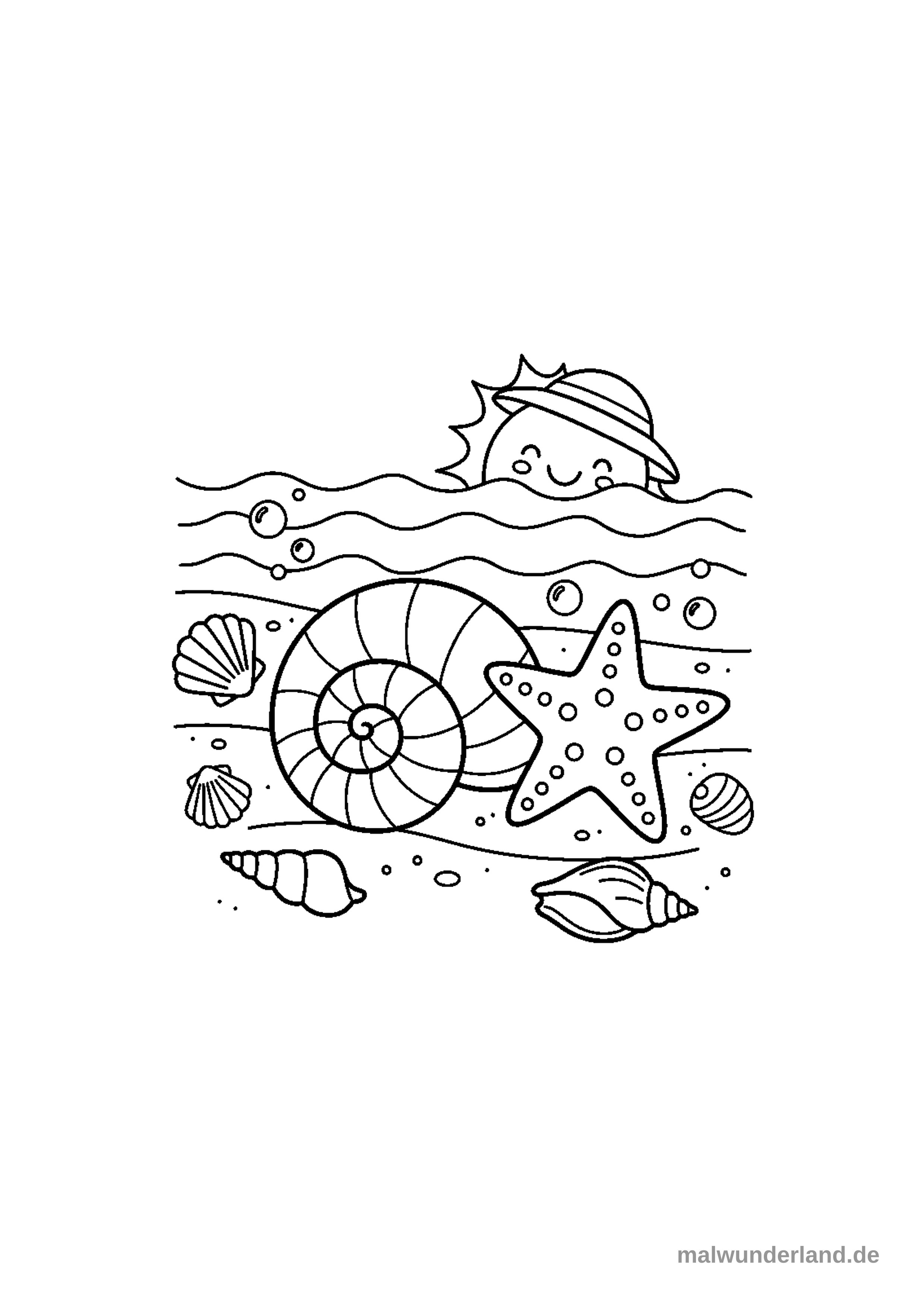 Ein sommerliches Ausmalbild zeigt eine Unterwasserszene mit einem lächelnden Sonnenkopf, der über den Wellen hervorblickt. Auf dem sandigen Meeresgrund befinden sich eine große Spiralschnecke, ein Seestern und verschiedene kleinere Muscheln, umgeben von Luftblasen.