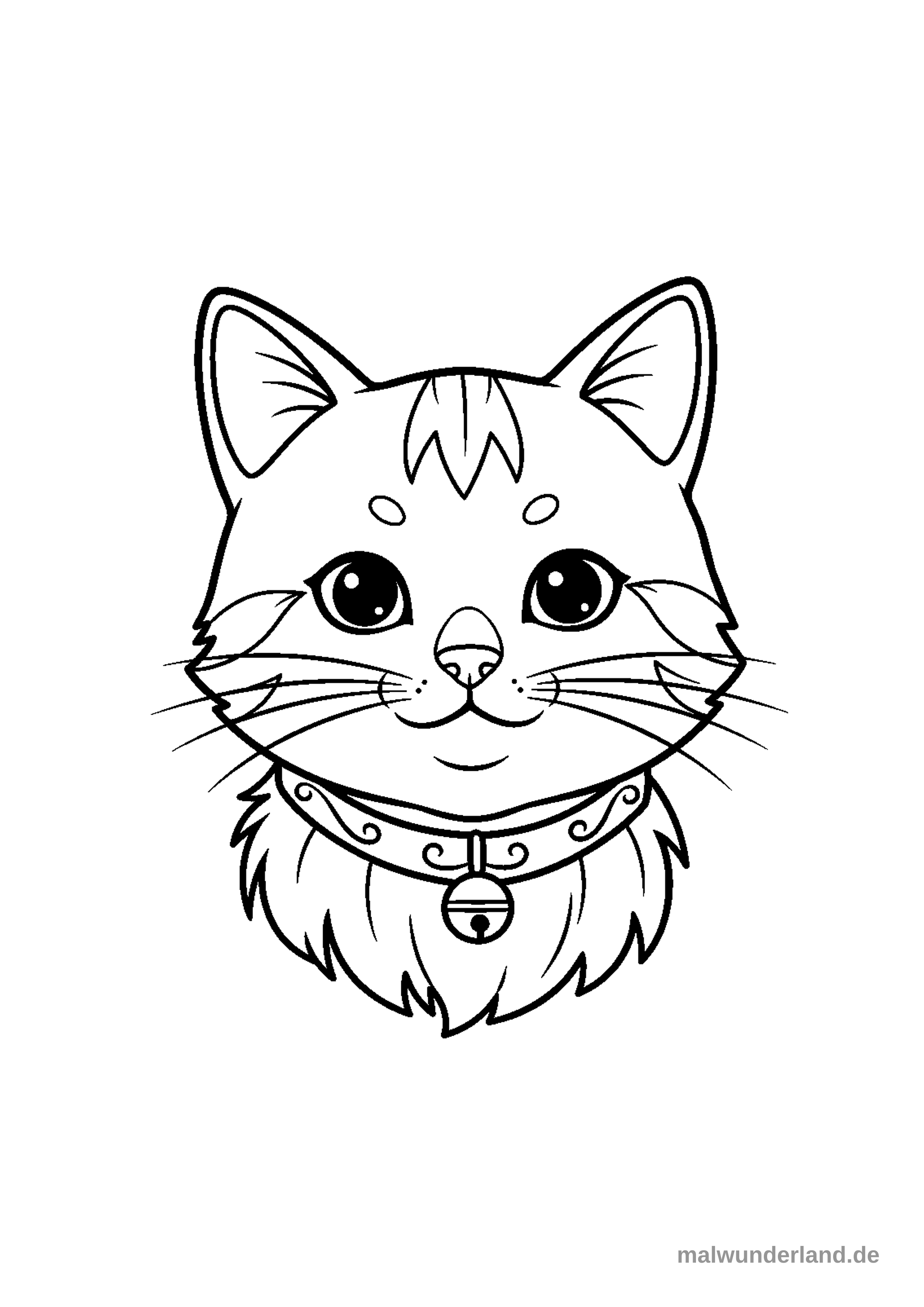Das Bild zeigt das Porträt eines niedlichen Kätzchens als detaillierte Schwarz-Weiß-Linienzeichnung, perfekt zum Ausmalen. Die Katze hat große Augen, Schnurrhaare und trägt ein verziertes Halsband mit einem kleinen Glöckchen am unteren Hals.