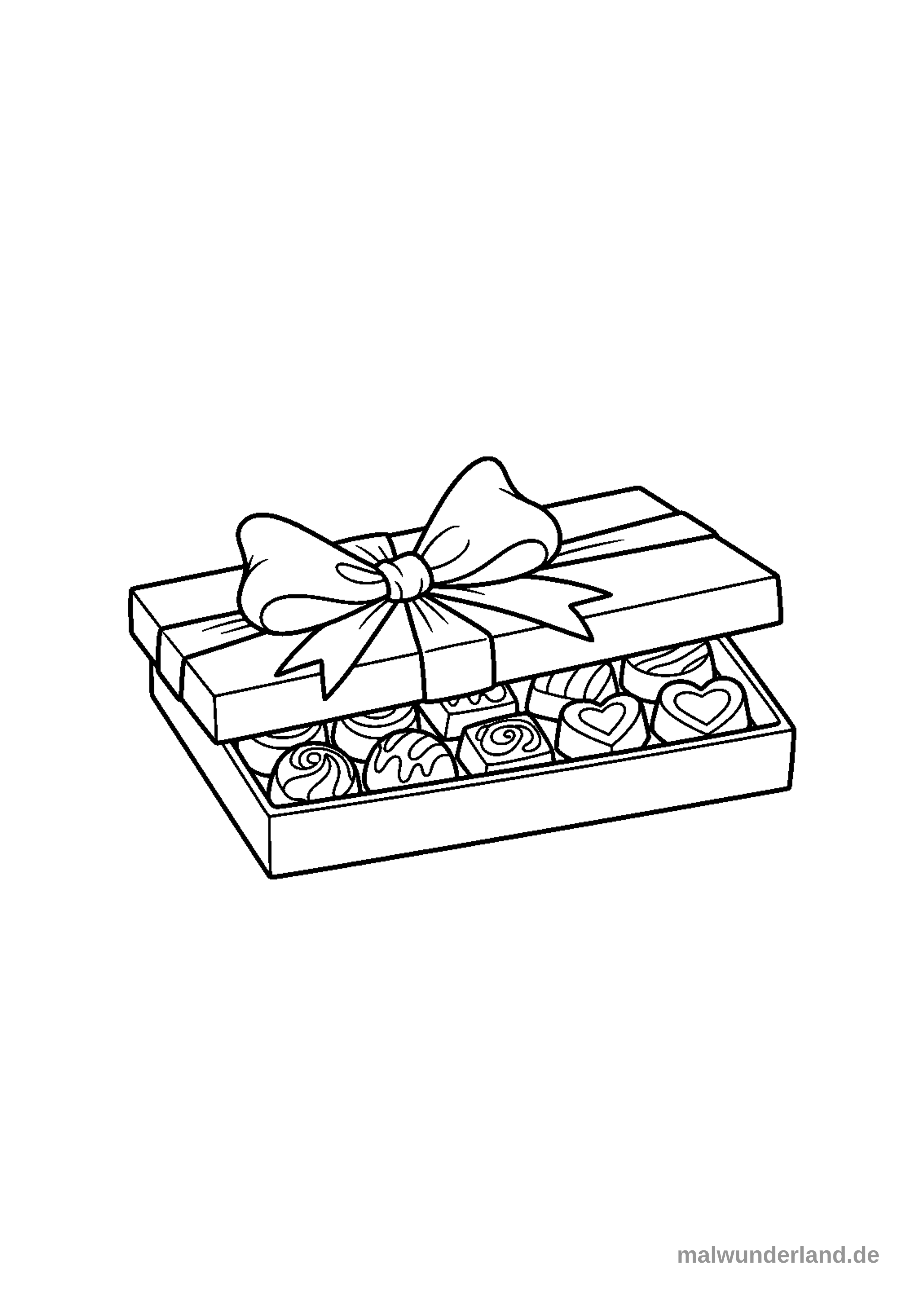 Male die Außenseite der Pralinenschachtel in einem freundlichen Hellbraun oder Rosa. Die große Schleife könnte leuchtend Rot oder eine andere festliche Farbe wie Gold haben. Die herzförmigen Pralinen kannst du entweder in zartem Rosa oder klassischem Dunkelbraun gestalten. Die anderen Pralinen im Inneren können in verschiedenen Schattierungen von Braun, Weiß und sogar mit bunten Verzierungen bemalt werden.
