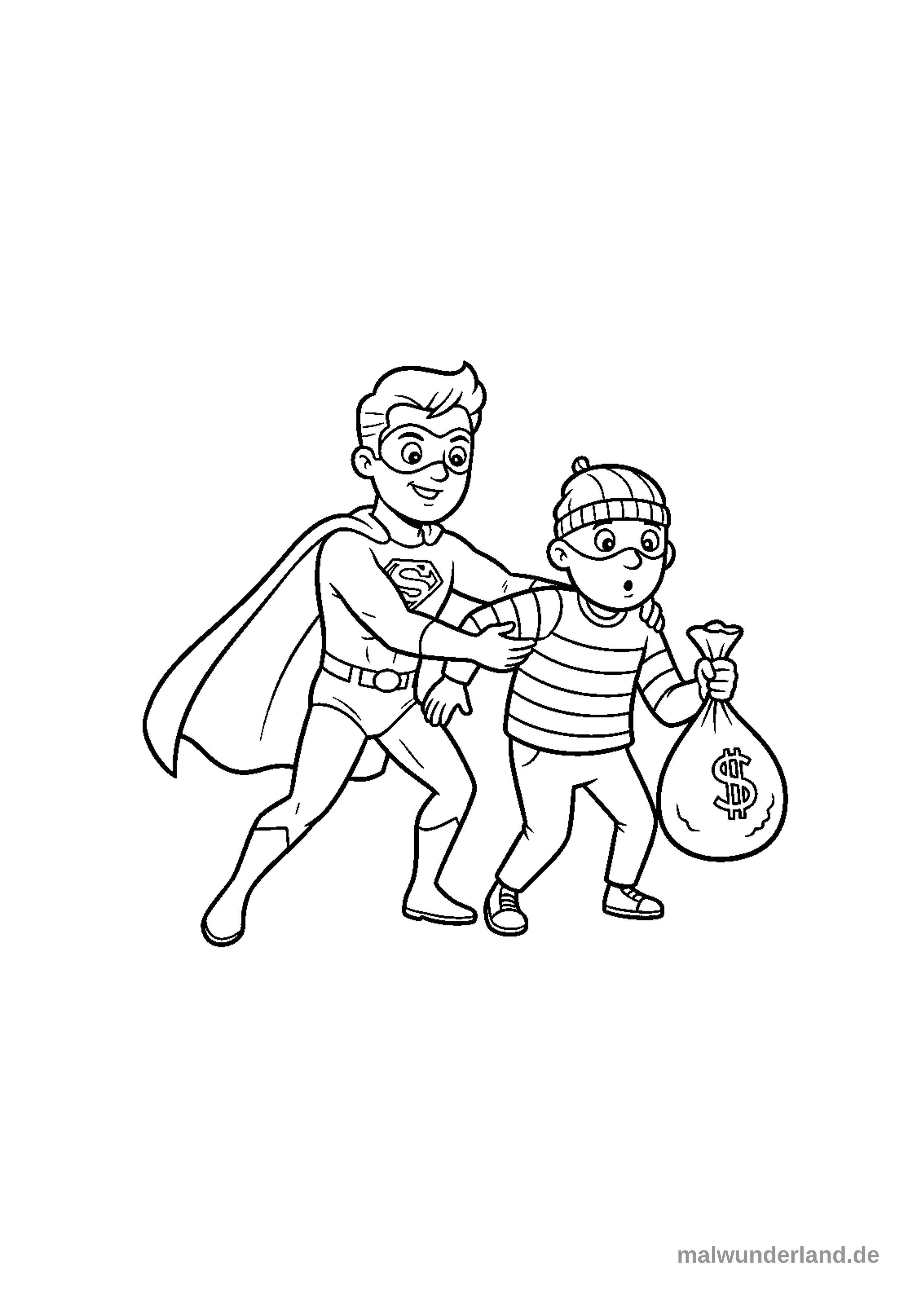 Ein lächelnder Superheld in Umhang und Maske hält einen Dieb fest, der eine Geldtasche mit einem Dollarzeichen bei sich trägt und überrascht schaut. Die Szene zeigt den Superhelden, wie er den Dieb nach einer Verfolgungsjagd stellt.