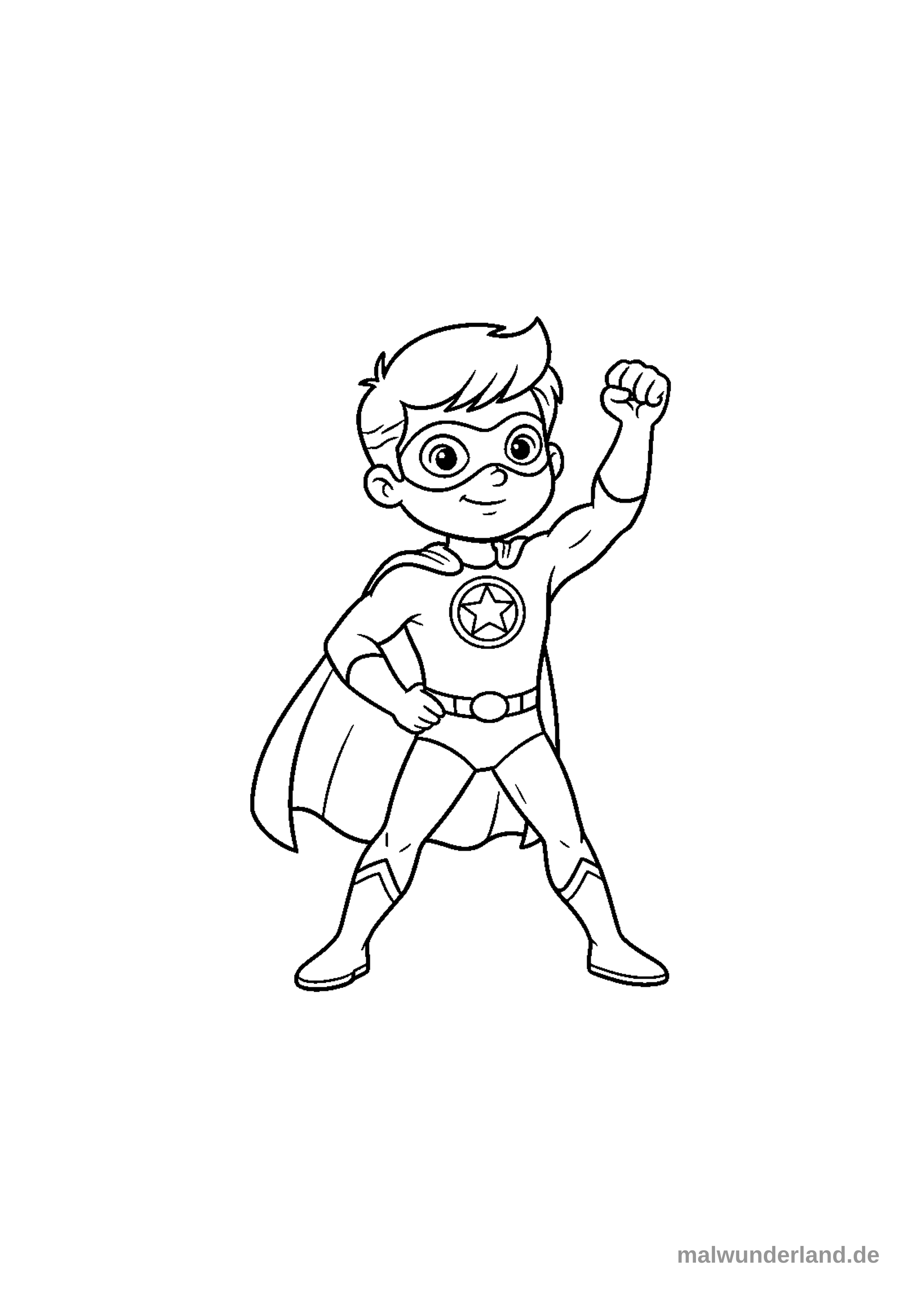 Ein Ausmalbild zeigt einen Jungen, der als Superheld verkleidet ist und in einer selbstbewussten Pose steht. Er trägt eine Augenmaske, einen fliegenden Umhang, einen eng anliegenden Anzug mit einem Sternemblem auf der Brust, einen Gürtel und hohe Stiefel.