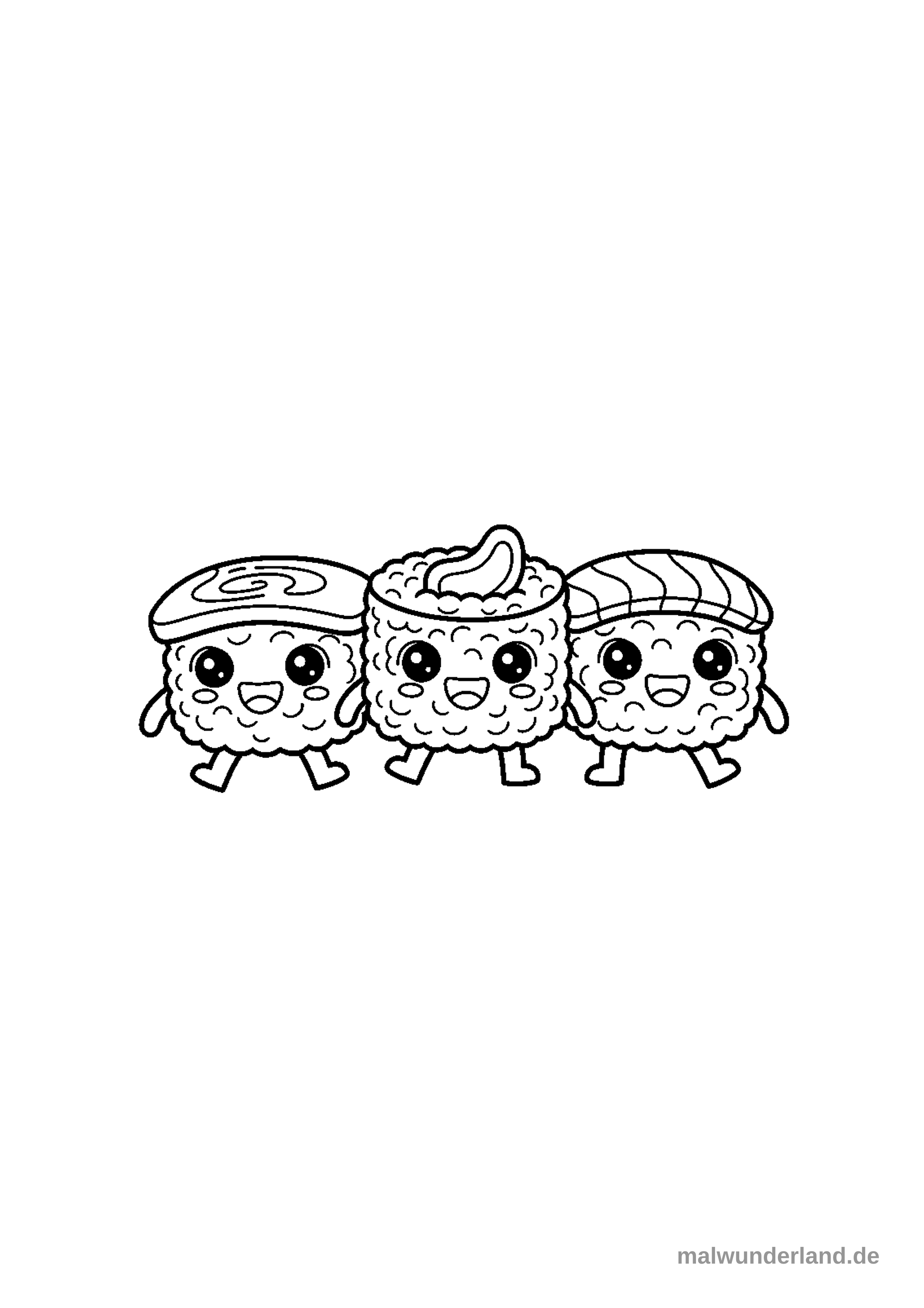 Diese drei Sushi-Freunde heißen Maki, Nigiri und Temaki. Sie lieben es, zusammen Abenteuer zu erleben und neue Freunde kennenzulernen. Heute freuen sie sich, von dir bunt ausgemalt zu werden!