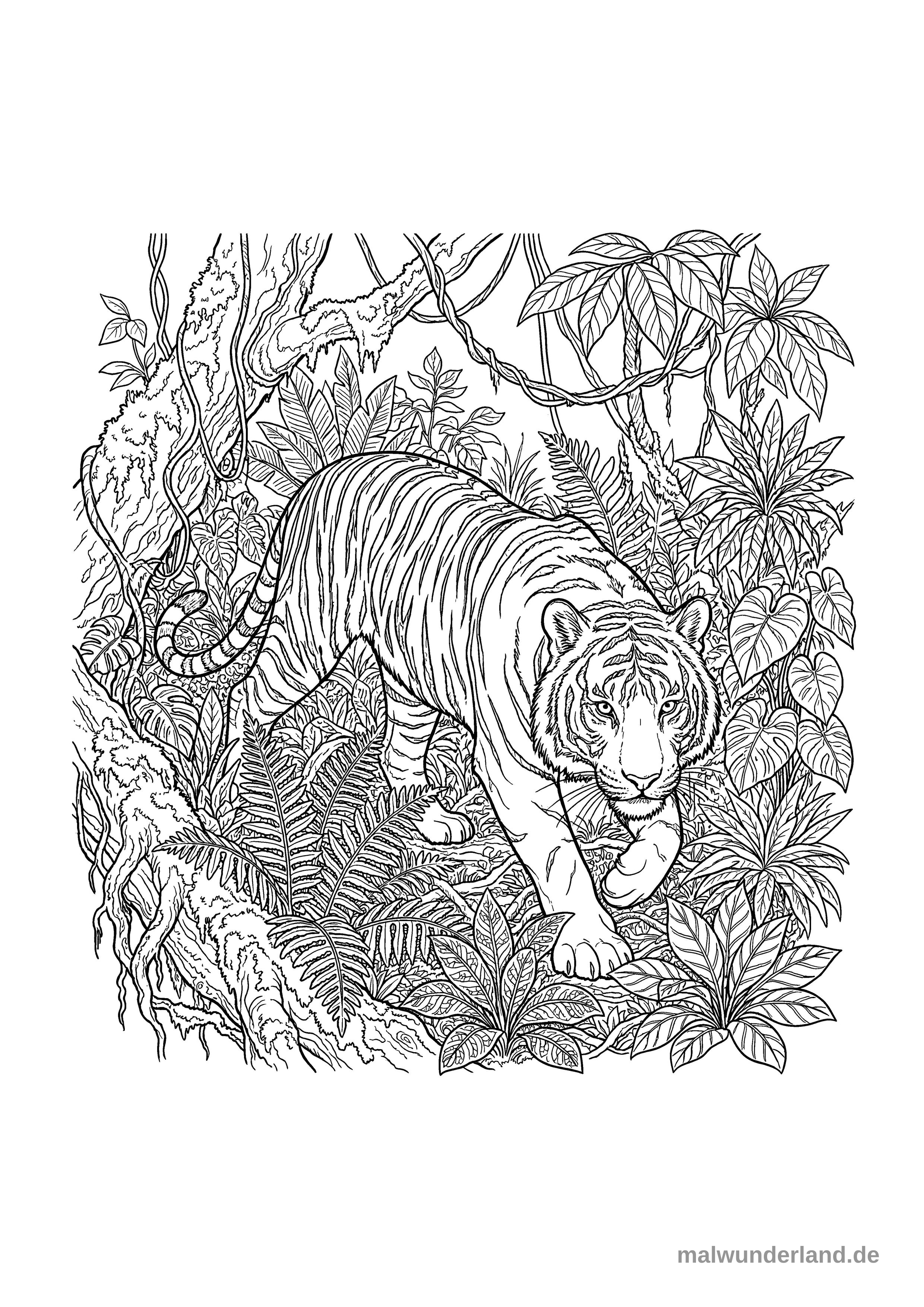Male den Tiger in warmen Orangetönen mit kräftigen schwarzen Streifen. Seine Augen könnten bernsteinfarben oder grün sein. Die verschiedenen Blätter und Farne können in vielen Grüntönen ausgemalt werden, von hellem Limettengrün bis zu tiefem Waldgrün, um Tiefe zu erzeugen. Die Baumstämme und dicken Lianen lassen sich gut in verschiedenen Brauntönen, Erdtönen oder sogar Grau-Schattierungen gestalten.