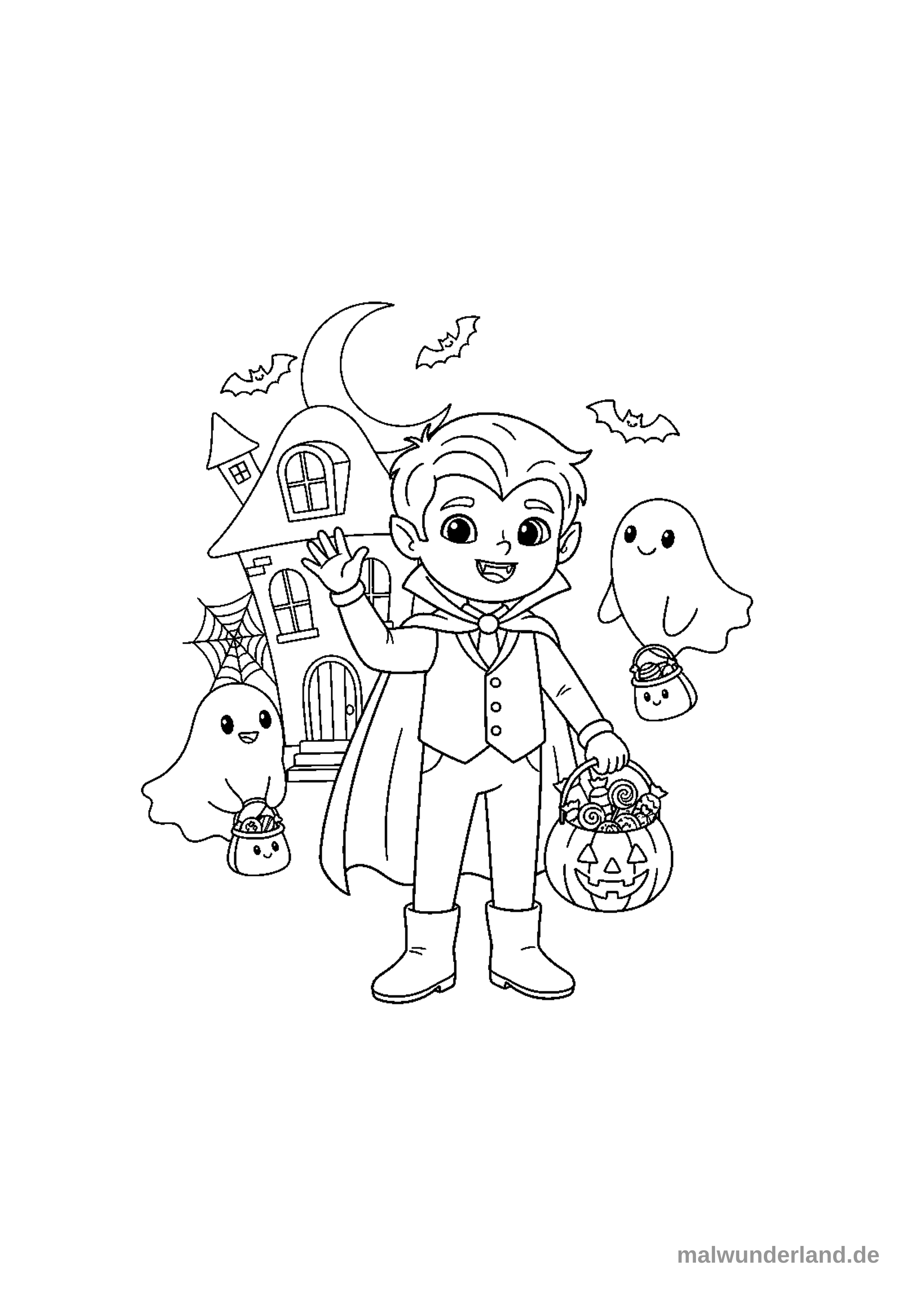 Das Ausmalbild zeigt einen freundlichen, als Vampir verkleideten Jungen, der winkt und einen Kürbiseimer voller Süßigkeiten hält. Er steht vor einem Spukhaus, umgeben von zwei niedlichen Geistern, fliegenden Fledermäusen, einem Spinnennetz und einem Sichelmond.